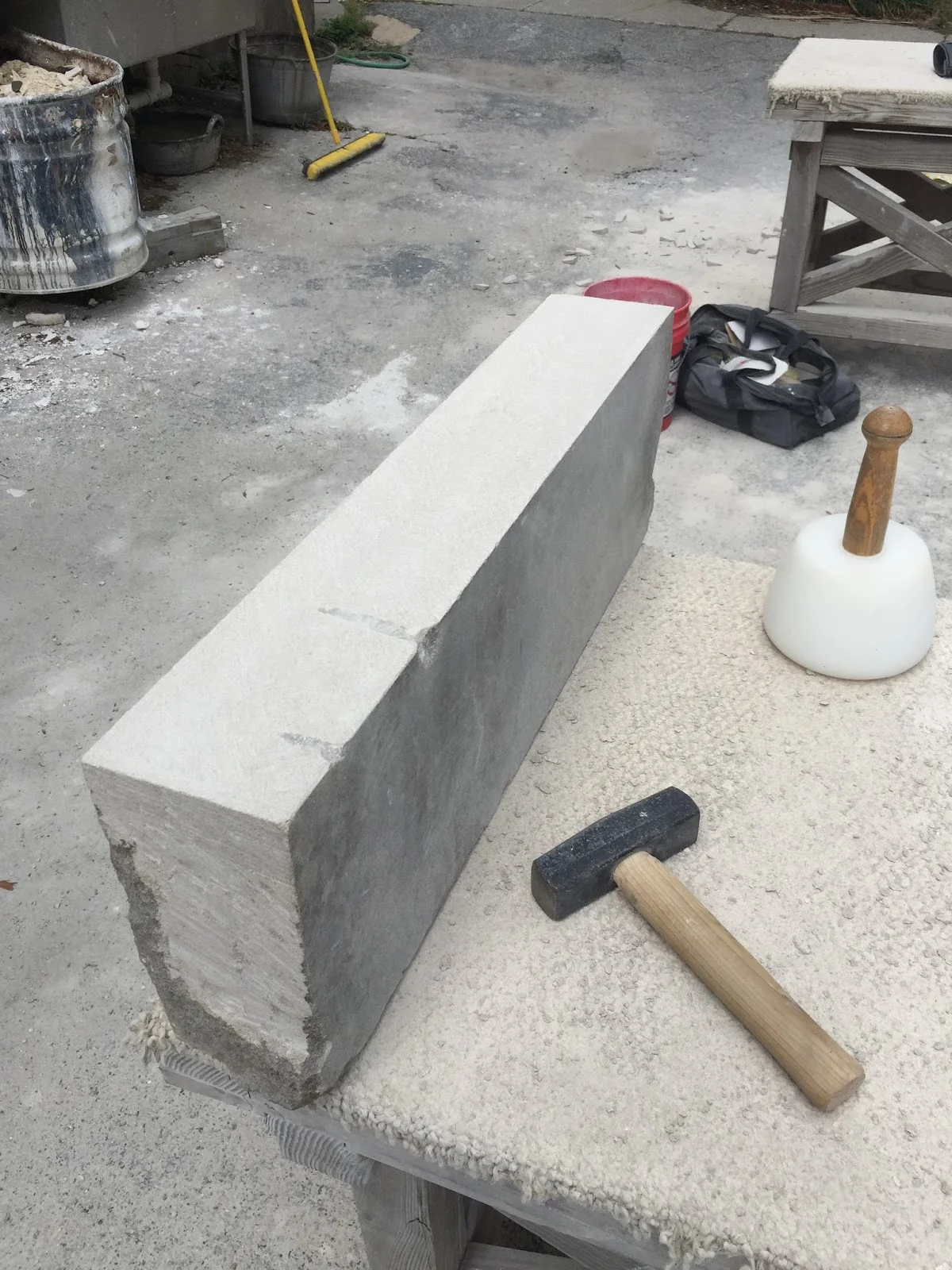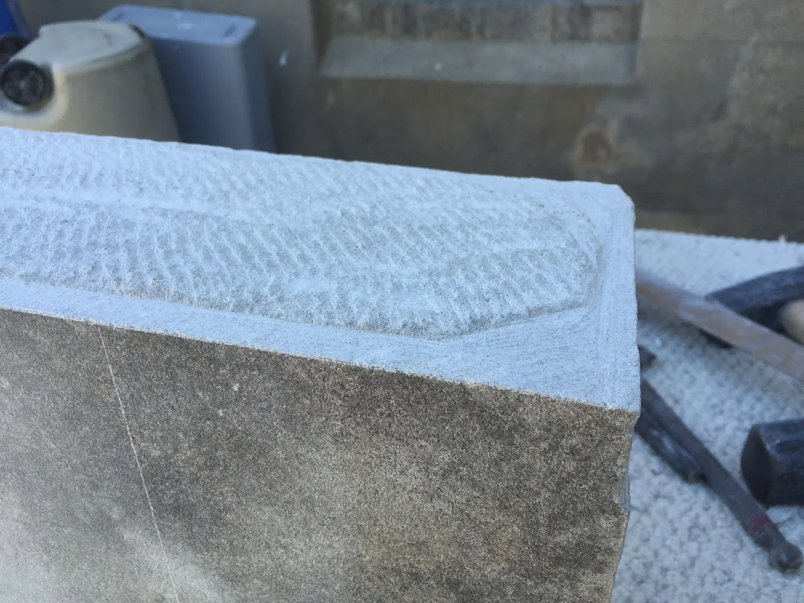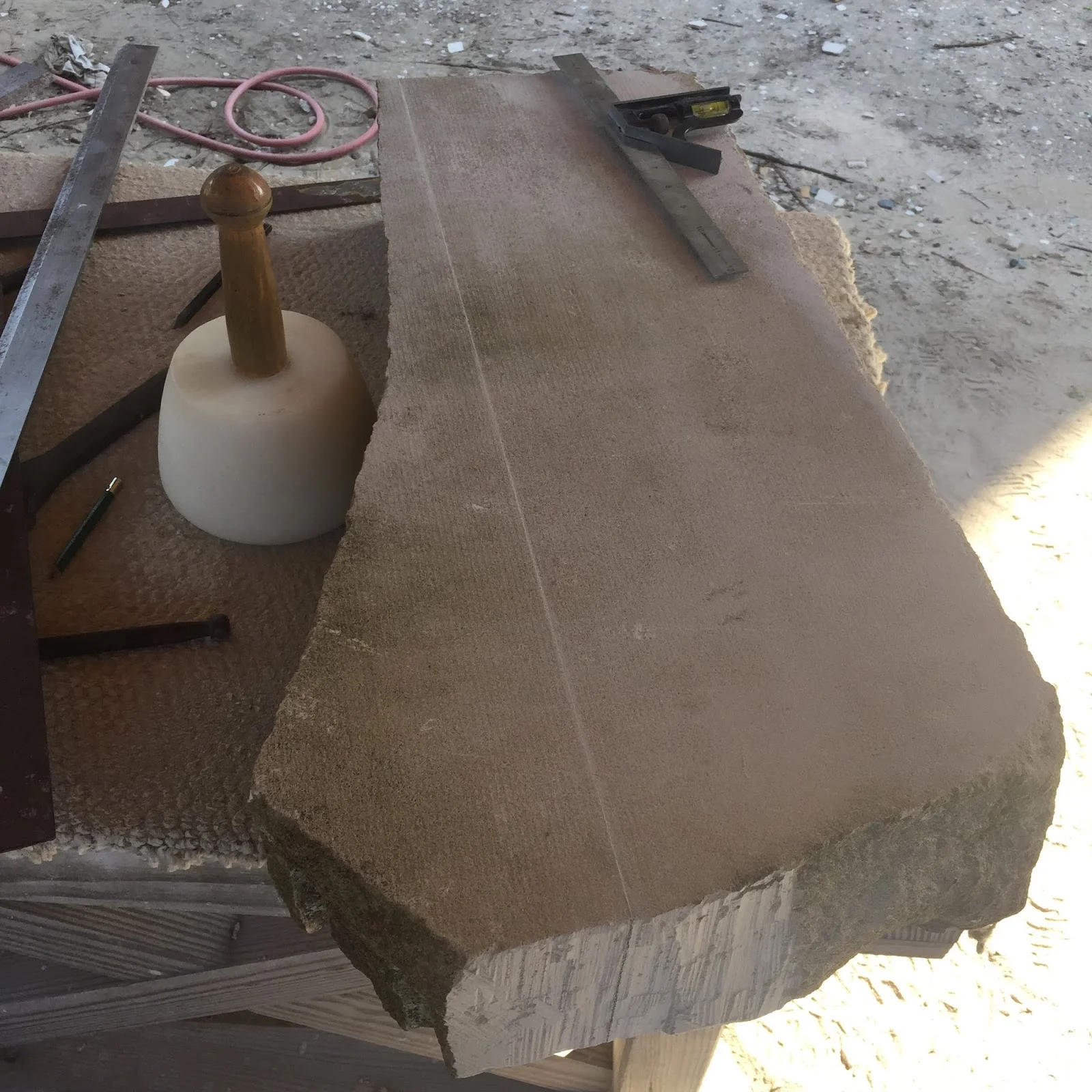 I forgot to take pictures because I was so excited to start but this is fairly early in the process. For my first project I am working on squaring a irregular piece of stone. Here you can see where we scored the block, and I have cleaned up the rough edges on one side. The next step is to work down all the excess stone on the other side of the line.