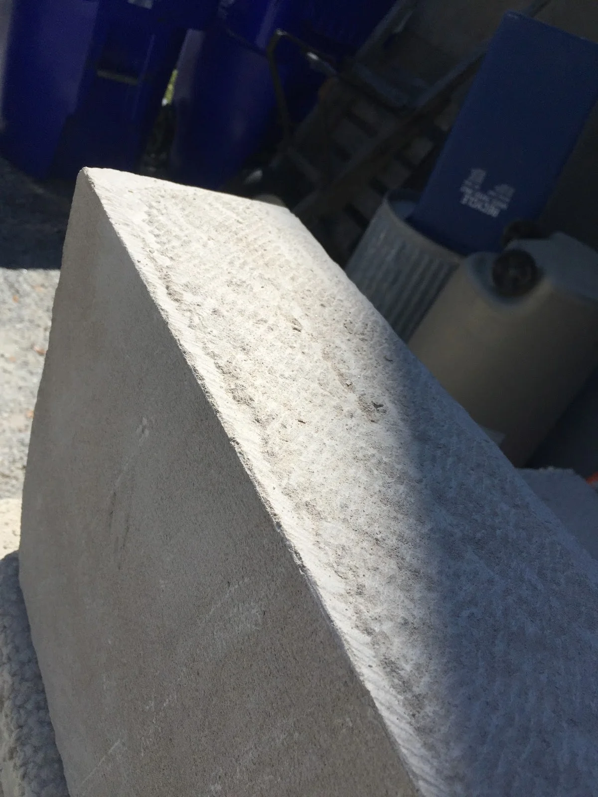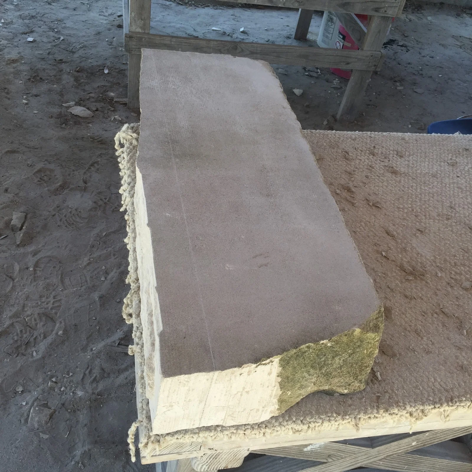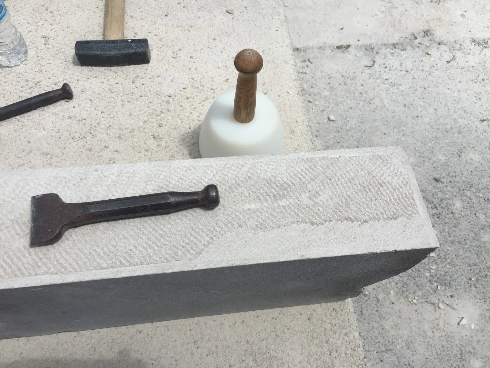 I forgot to take pictures because I was so excited to start but this is fairly early in the process. For my first project I am working on squaring a irregular piece of stone. Here you can see where we scored the block, and I have cleaned up the rough edges on one side. The next step is to work down all the excess stone on the other side of the line.