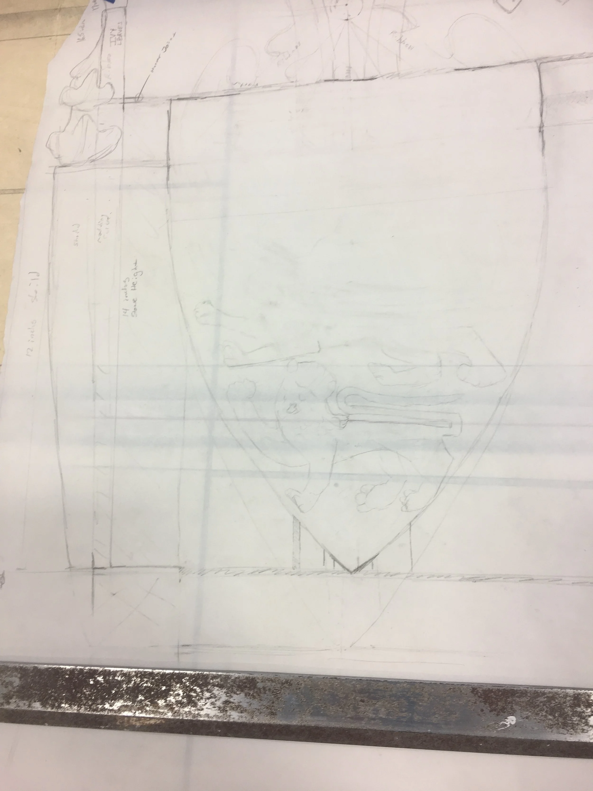For this project we would be making different coat of arms for the elenor cross project. My part of this project was to work on the english coat of arms. The first step was to do a rough drawing to get a different feel for the types of elements to be included. Photos of other contemporary coat of arms from the same period were looked at and design elements like picking english ivy were chosen. Different style of the three lions on the sheild were looked at and patterns were looked for that were similar in the different photos. The sheild is then measured and drawn out so a wooden base can be made.