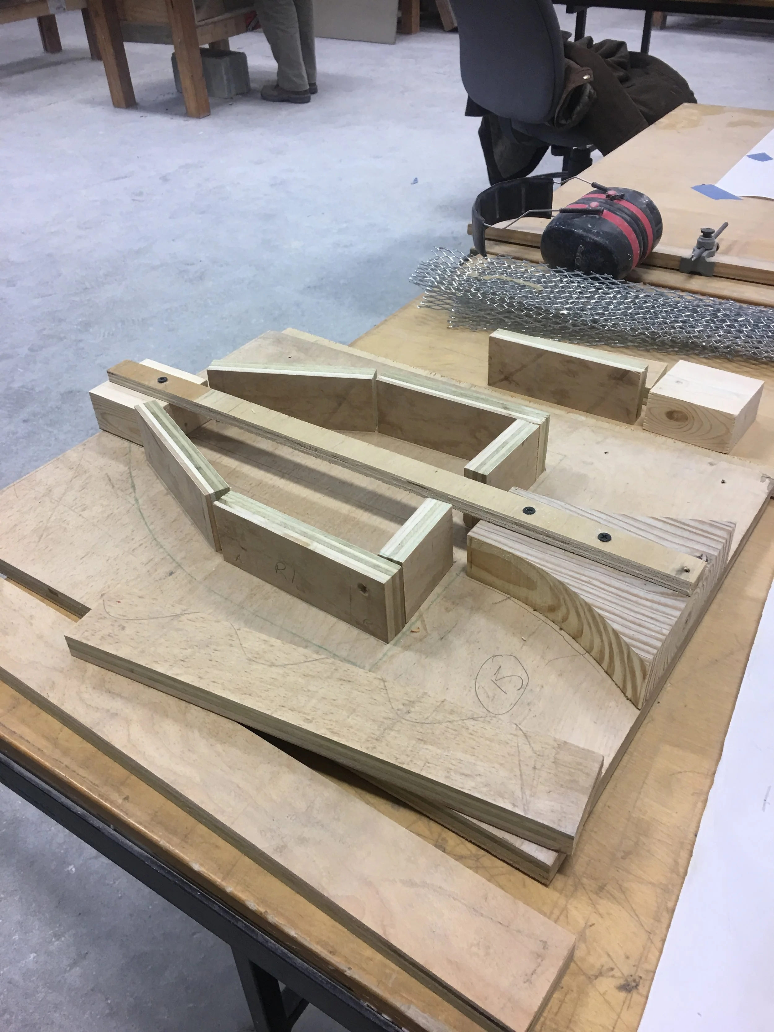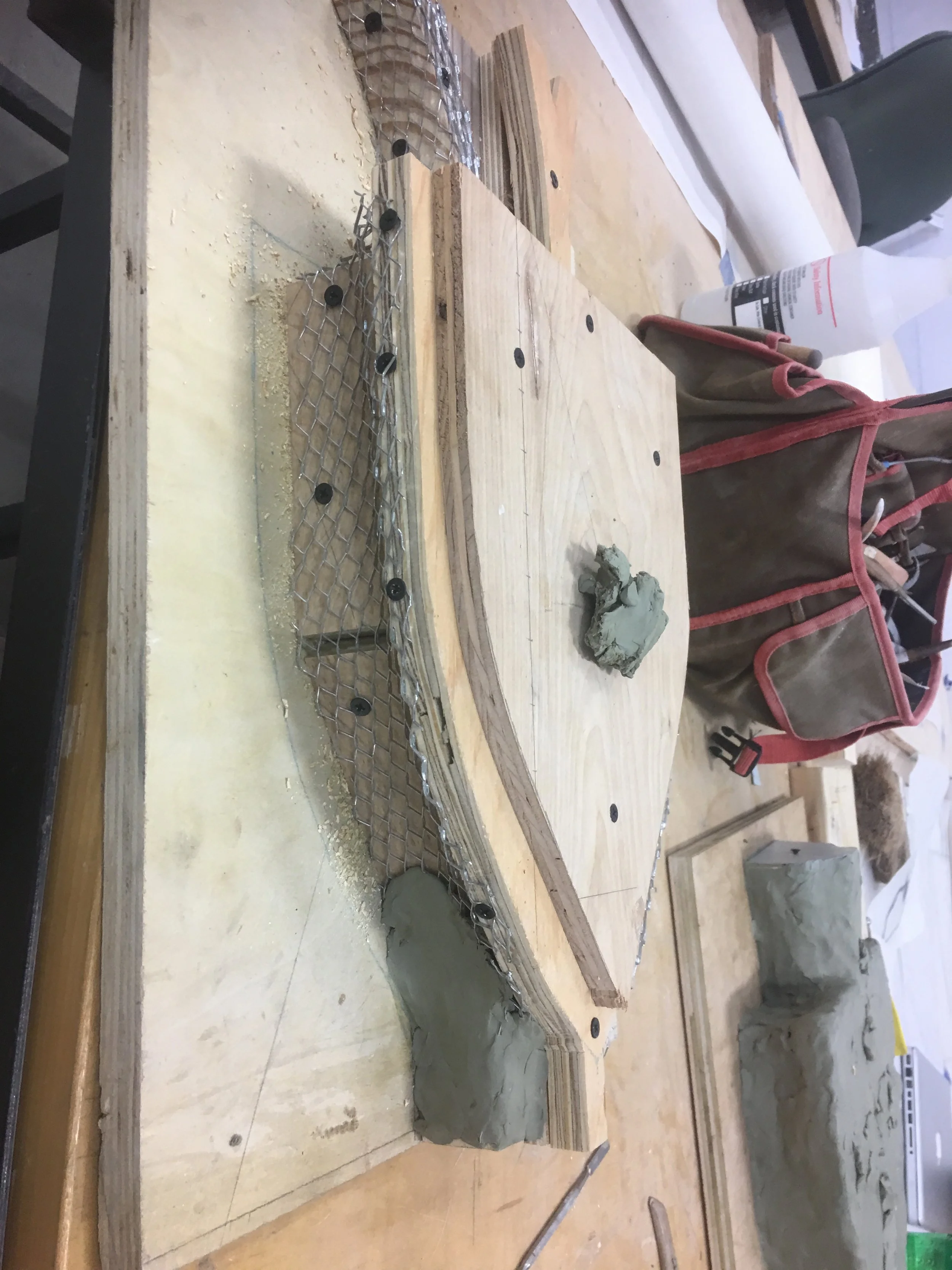 The wooden base is used for a scaffold for the clay sculpture. It is important that the wooden scaffold be sligtly smaller then the sculpture and have a suitable service for the clay to adhere to, but be large enough that excess clay is not wasted, and sturdy enough to hold its form.