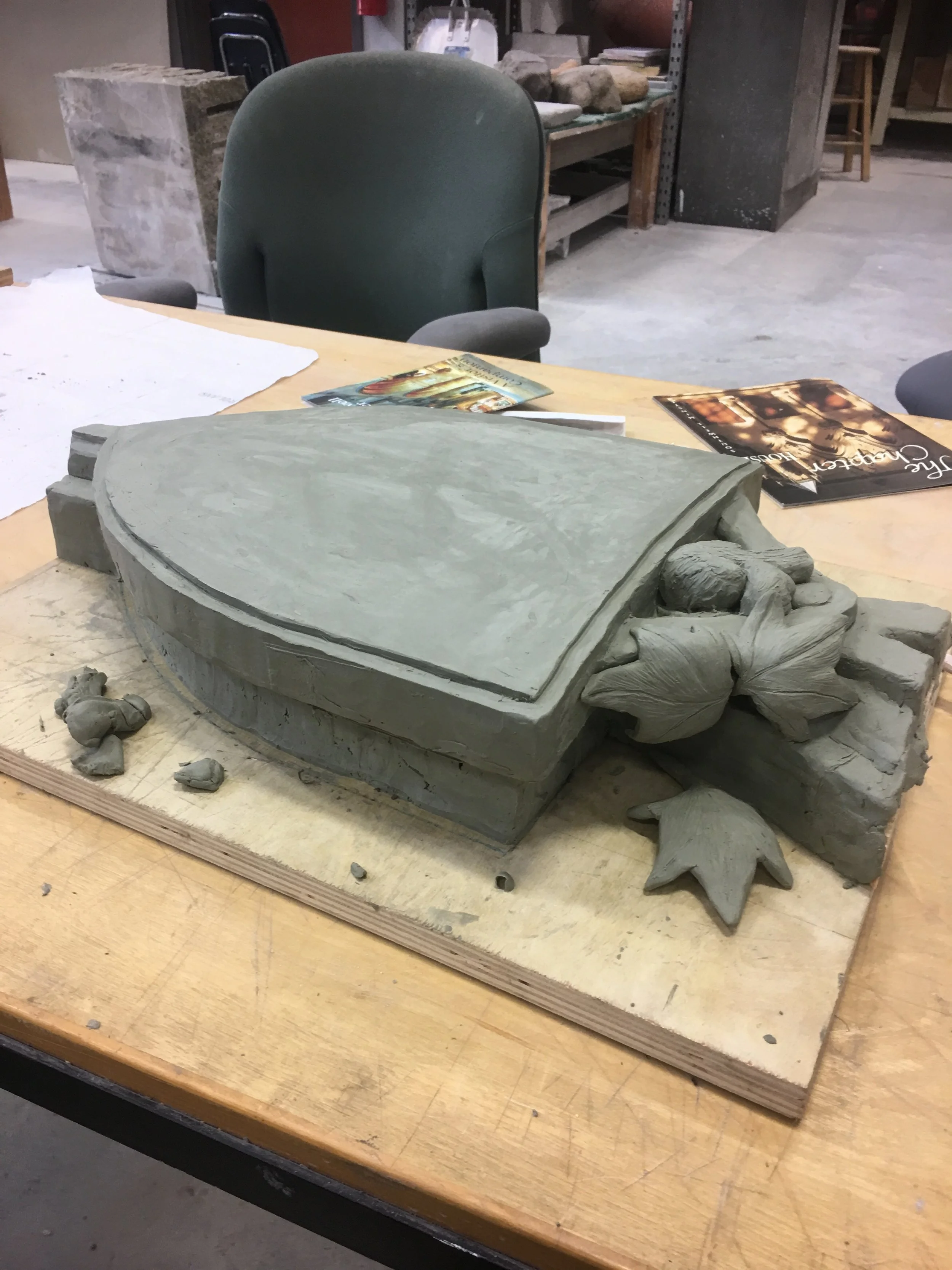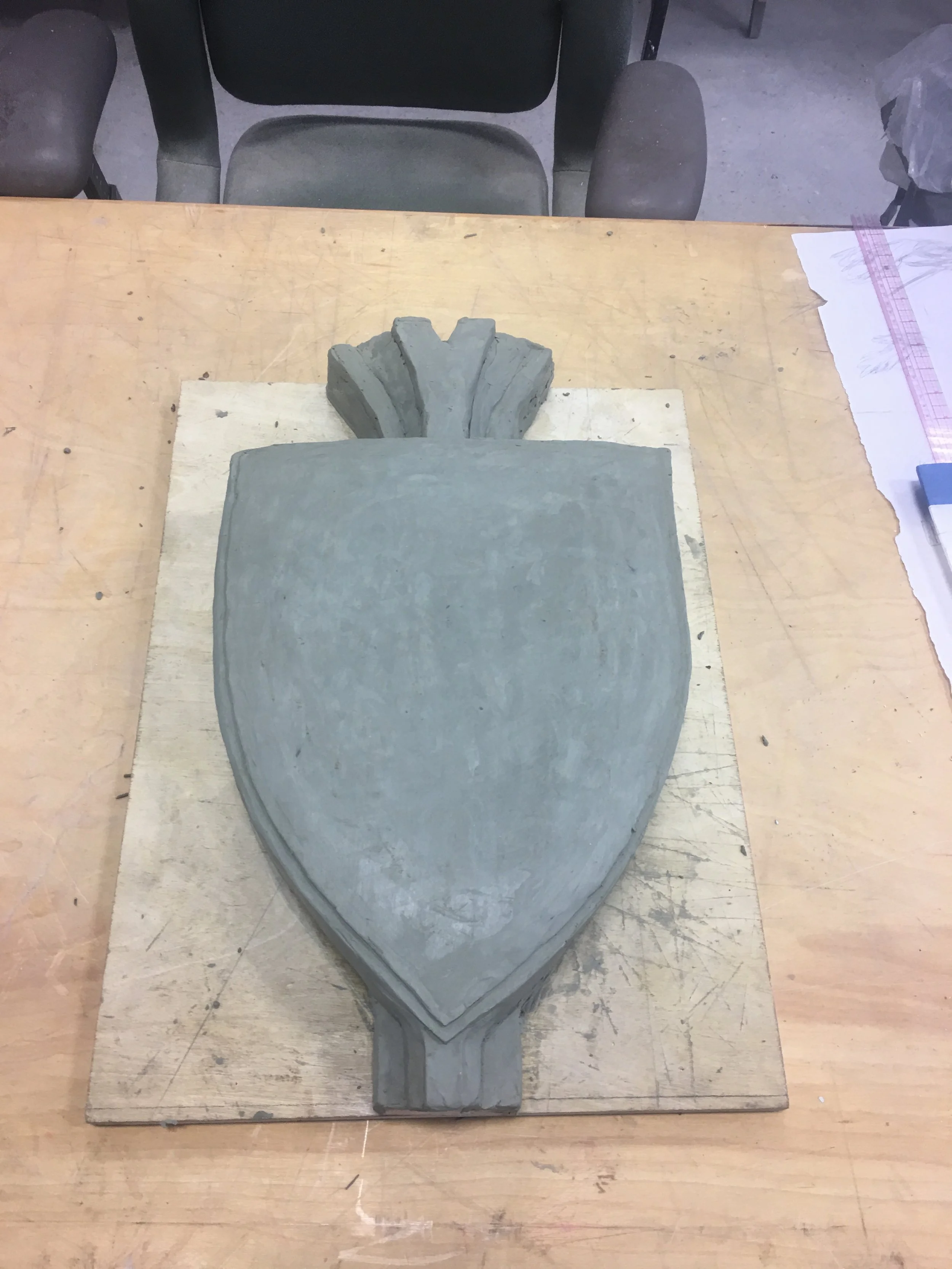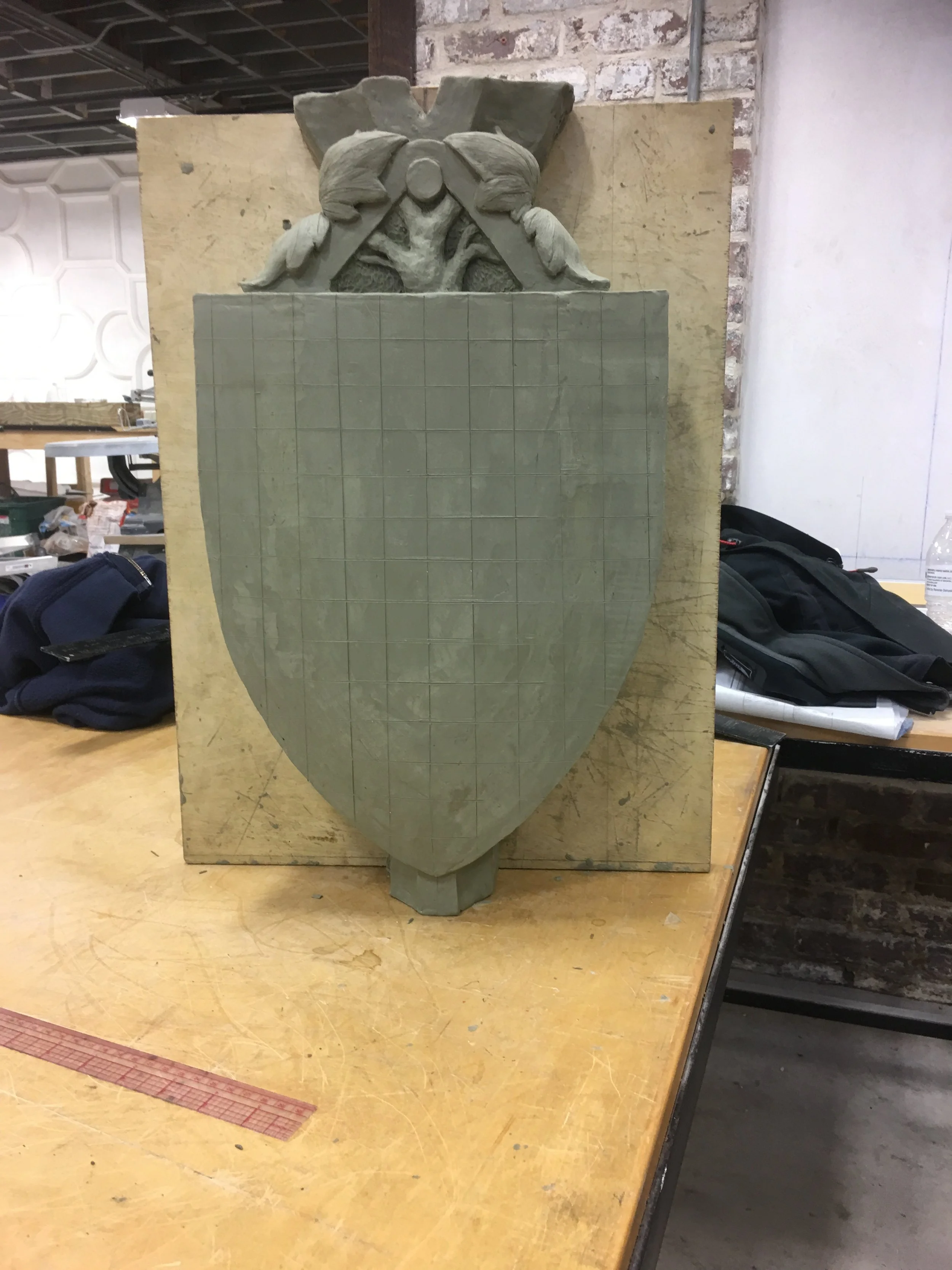 Once the scaffold is complete it is time to start the sculpture itself. I prefer to start with slightly excess clay and then remove it until it is the proper height. Elements that will be similar, like the ivy leaves I make one that i find to be correct, and then use that one to make copies of for the other leaves. The Lions themselves I left for after I had completed smoothing the sheild.