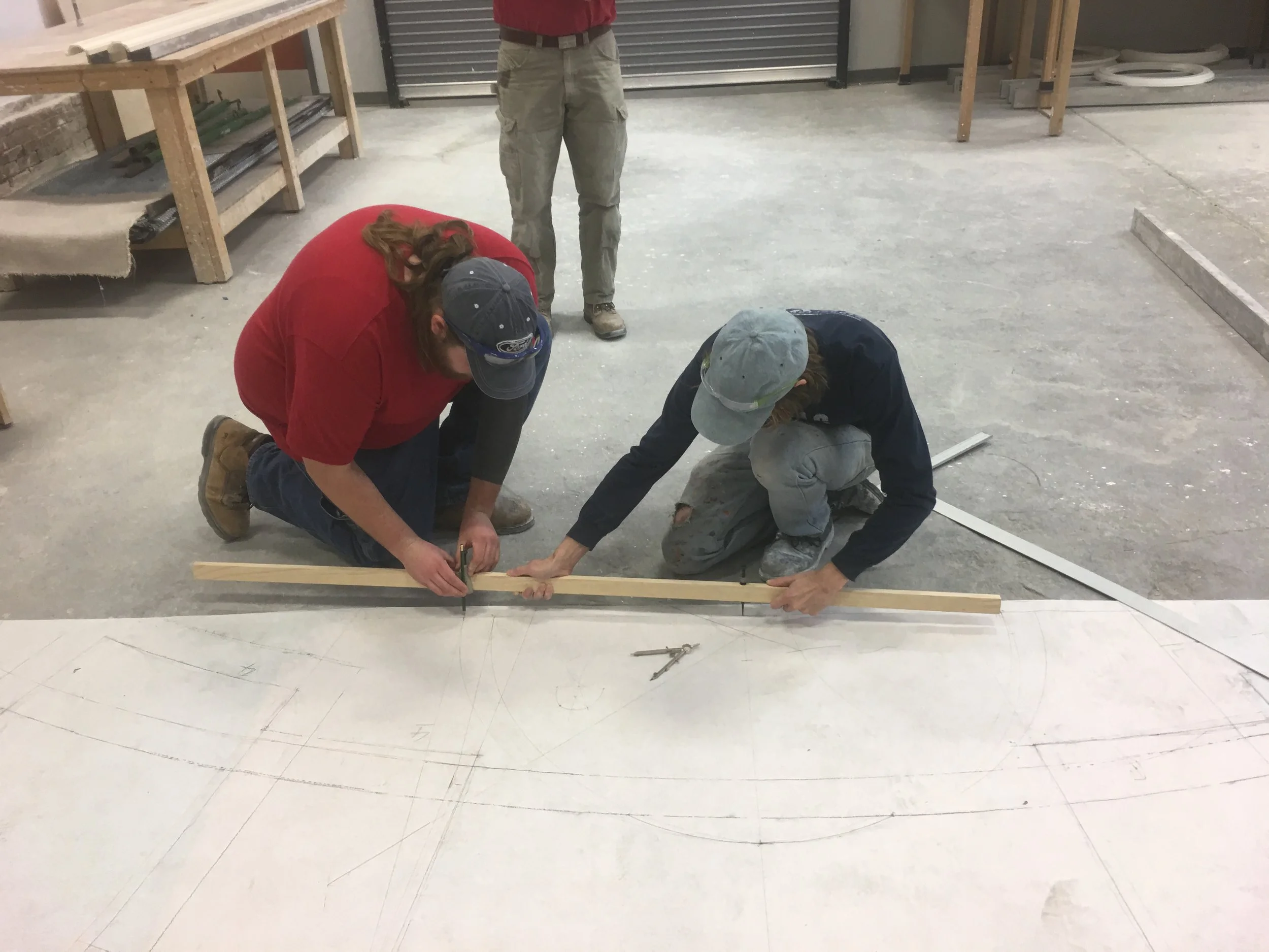 This semester we would be working on building an arch in the I'on development completing the work we had done last year. The wall we constructed last year would have an arch constructed across the main entrance to the I'on meeting house. The first step we took was to go to the location and take measurements of the pillars the arch would spring from. once we had the exact measurements we would then construct a form. Once the form was completed we were able to start work on the arch. In working the mortar for the arch we used a richer mortar mix then during normal masonry work. This is necessary because some variation will be necessary in the joints, and some areas will be thin, but other will be wider. Construction of the arch went quickly and smoothly with the formwork in place. Once all the bricks were in place we went over the joints using a grout bag to fill the joints. We then went over pointing any open spots and finally brushed the joints to make the work blend with the previous construction.