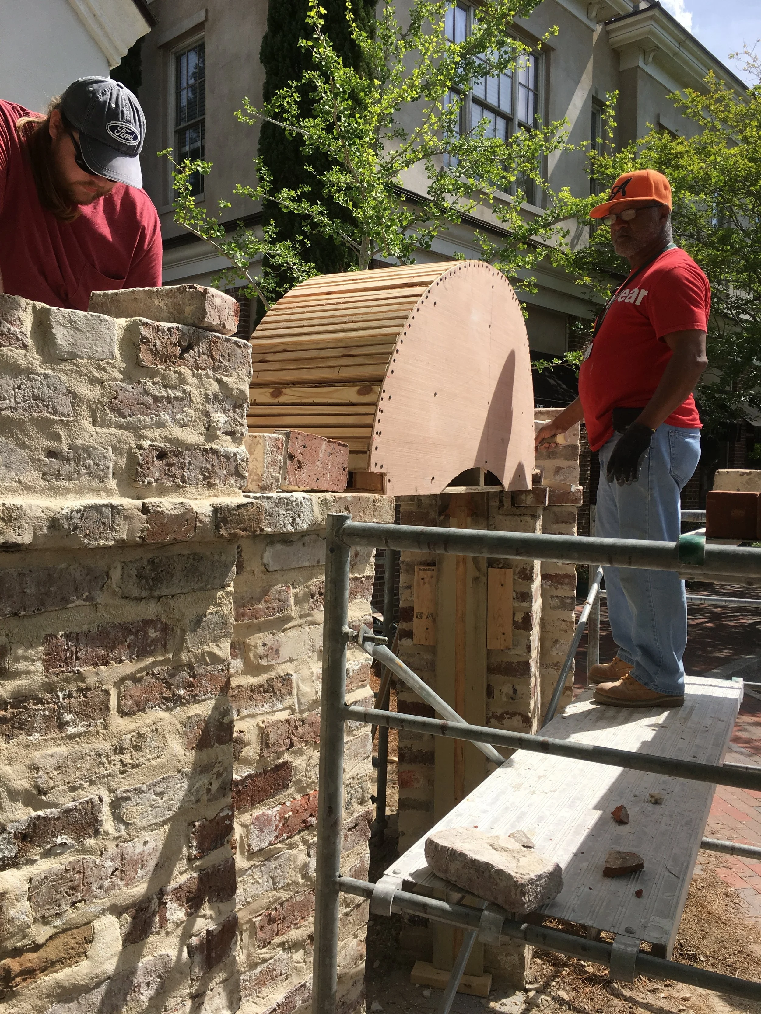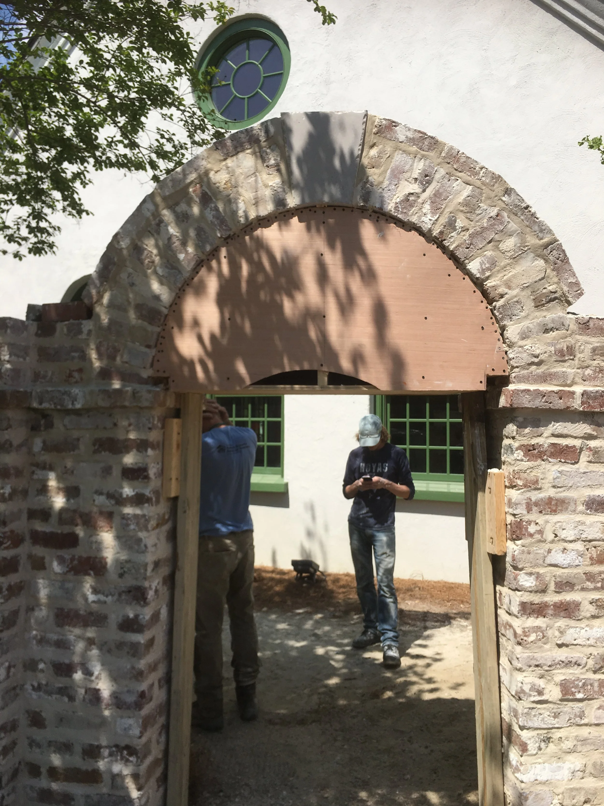 The arch and keystone in place. After this we would fill the mortar joints on the top of the arch with a grout bag.