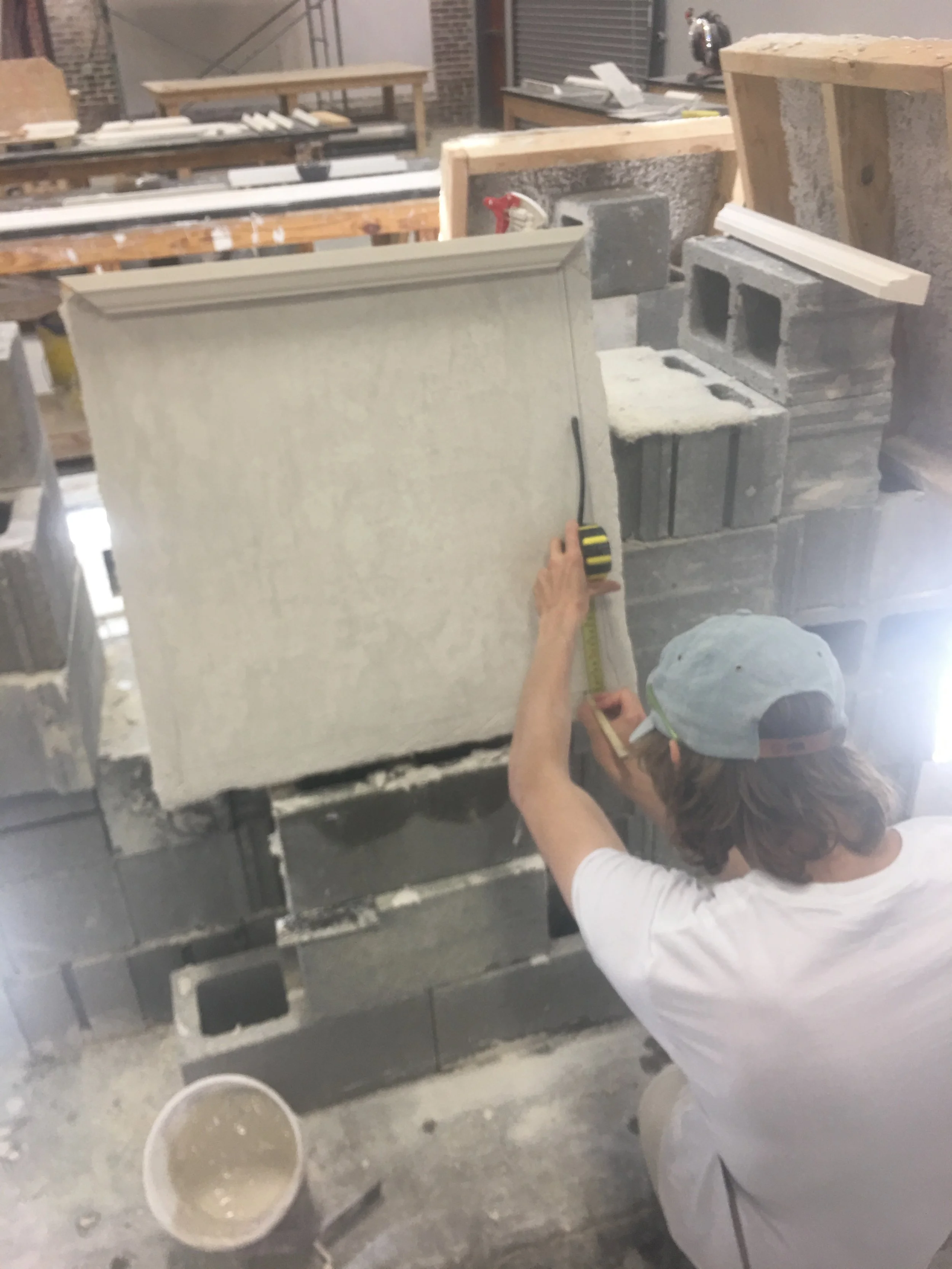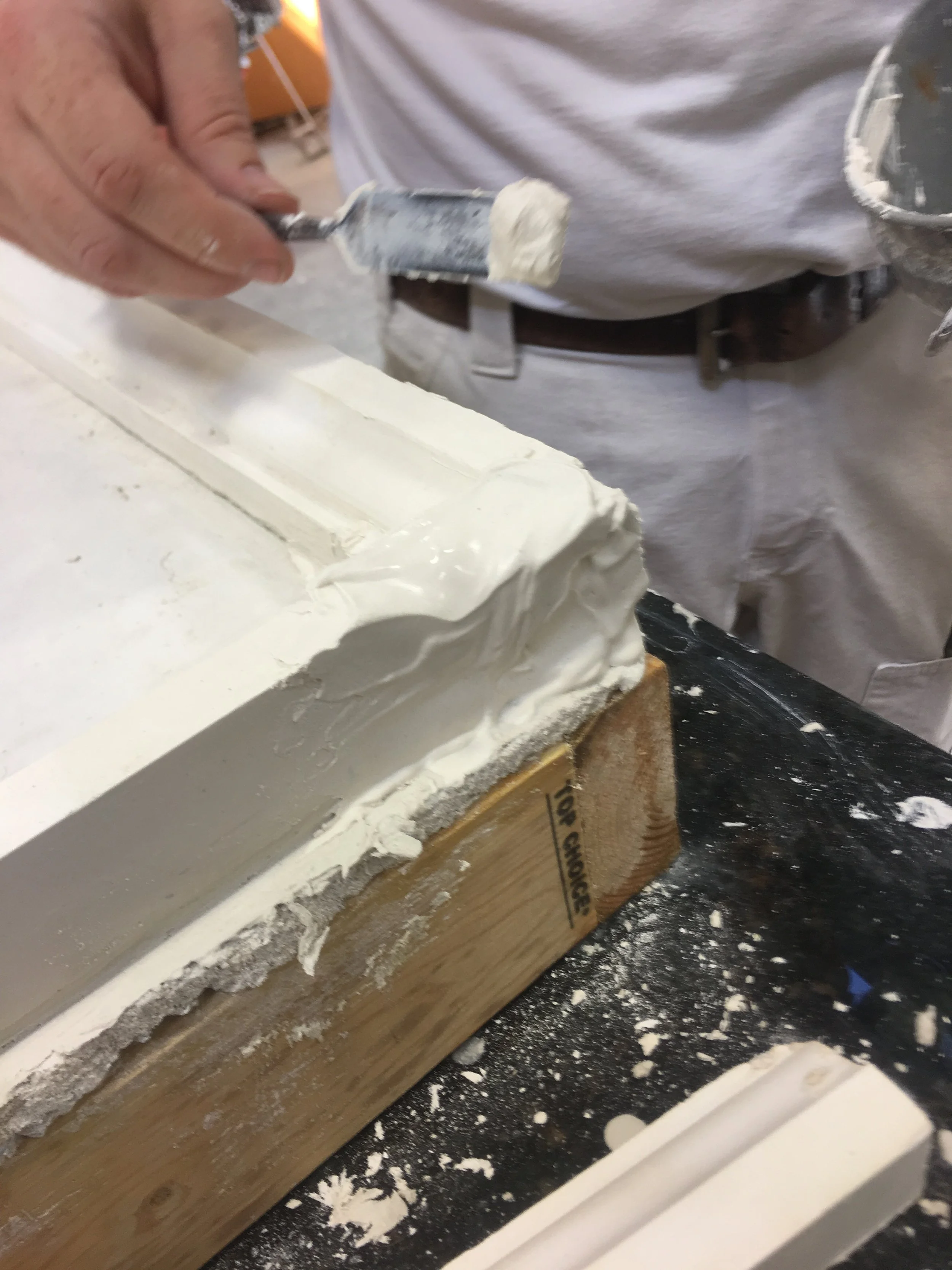 For this project we would be working with the plaster molds we had made earlier in the semester, when running on the table, and joining them together to form a trim. The first step we did was to create a wooden frame, then we applied a lathe to the frame and coated the lathe using the three coat plaster technique. Once the plaster had set on are frames we then measured each corner of the frame and used those measurements to cut our plaster trim. We then scored the back of the plaster trim to help it adhere to the 3 coat plaster frame. Once the trim was in place and dried we poured plaster into the gaps in the trim and smoothed the corners to blend the pieces of trim together.