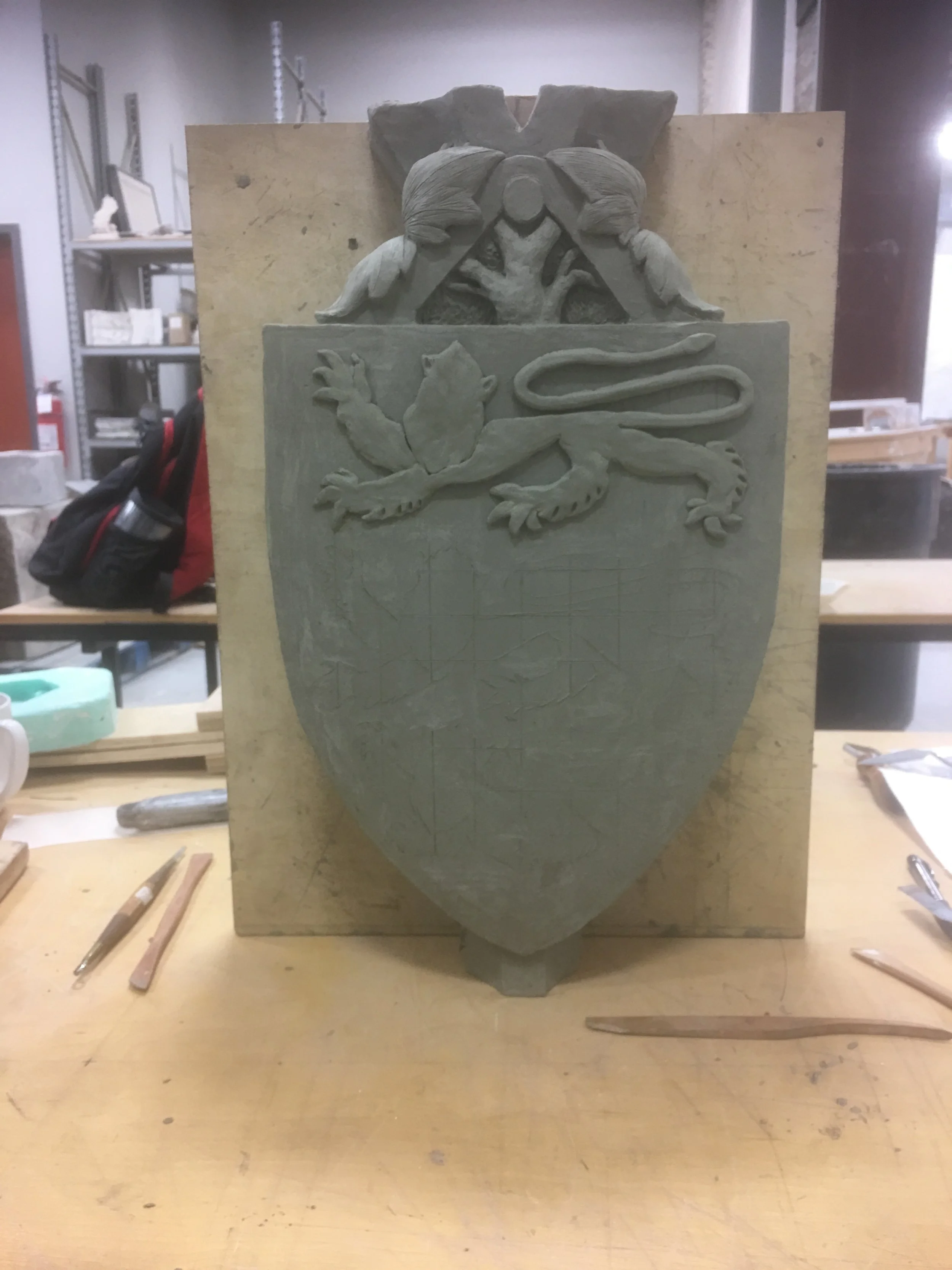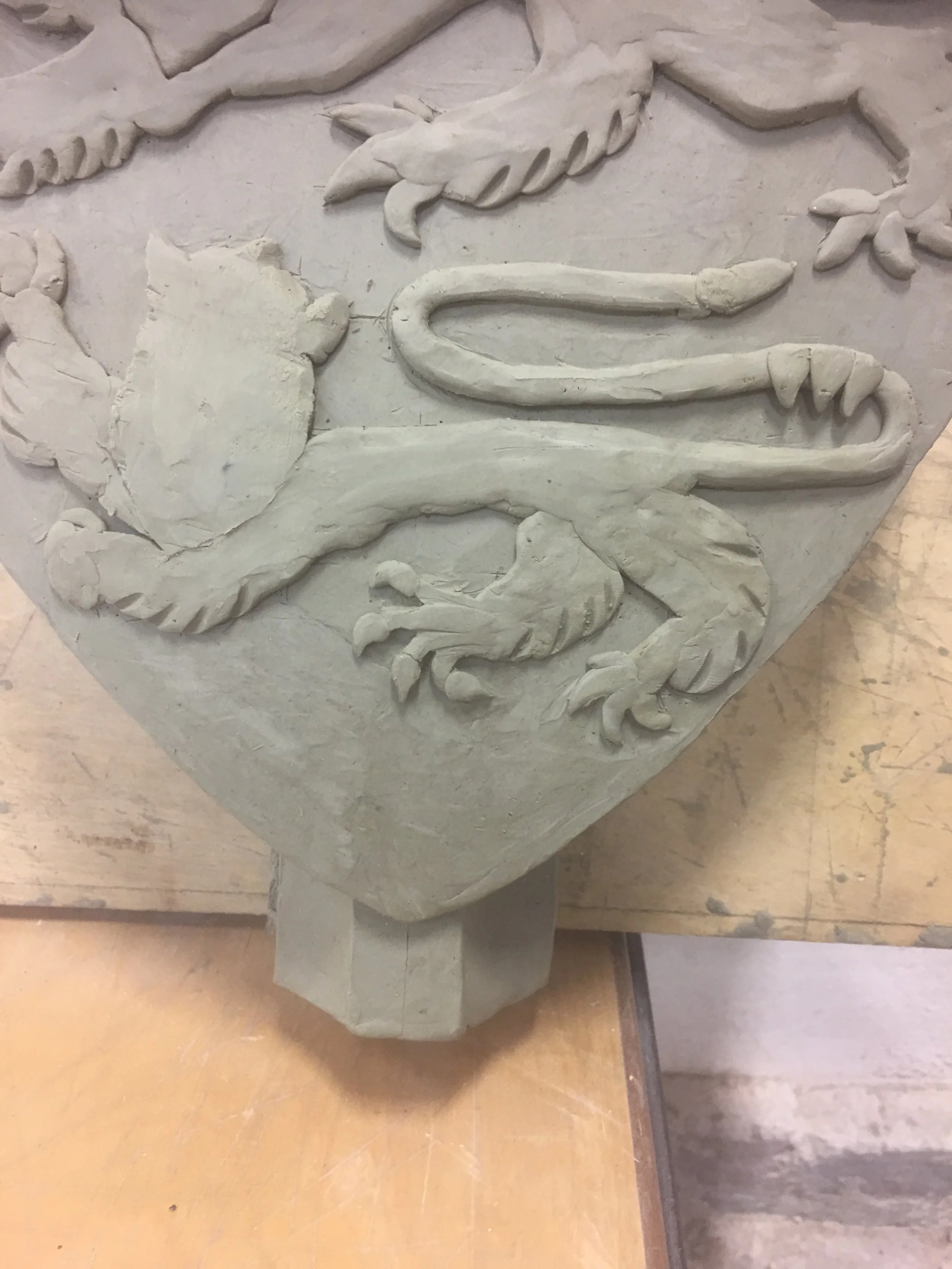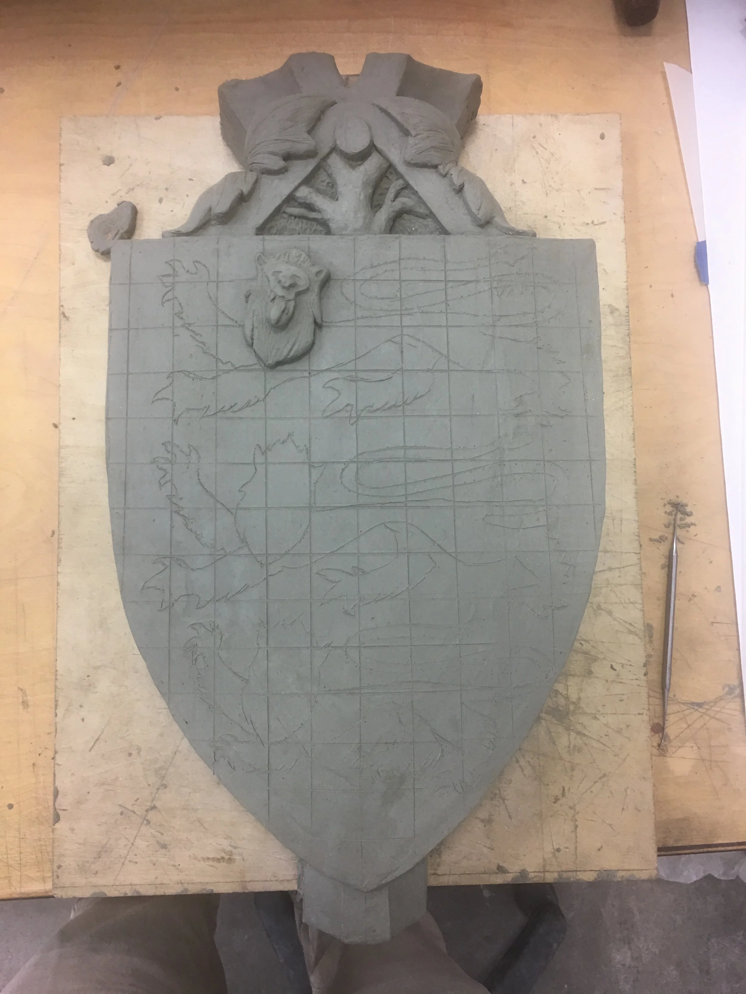 For this project I was assigned one of the three coat of arms shields for the Eleanor cross Project, the coat of arms representing England with three lions. After constructing the base for the sculpture last semester, this semester the goal is to finalize the lions themselves on the front of the shield. First a rough drawing was done to figure out the proportions and spacing and style of the lions, then a final scale drawing was done. After the drawing was complete a grid pattern was traced on to the shield to help with the spacing. Templates were then made and traced on to the clay, and then the rough forms of the lion were laid out in the clay. At this point the project is not completed, but the bottom lion is almost in a final state. The leaves on the top of the shield will also be passed over again before the project is complete.