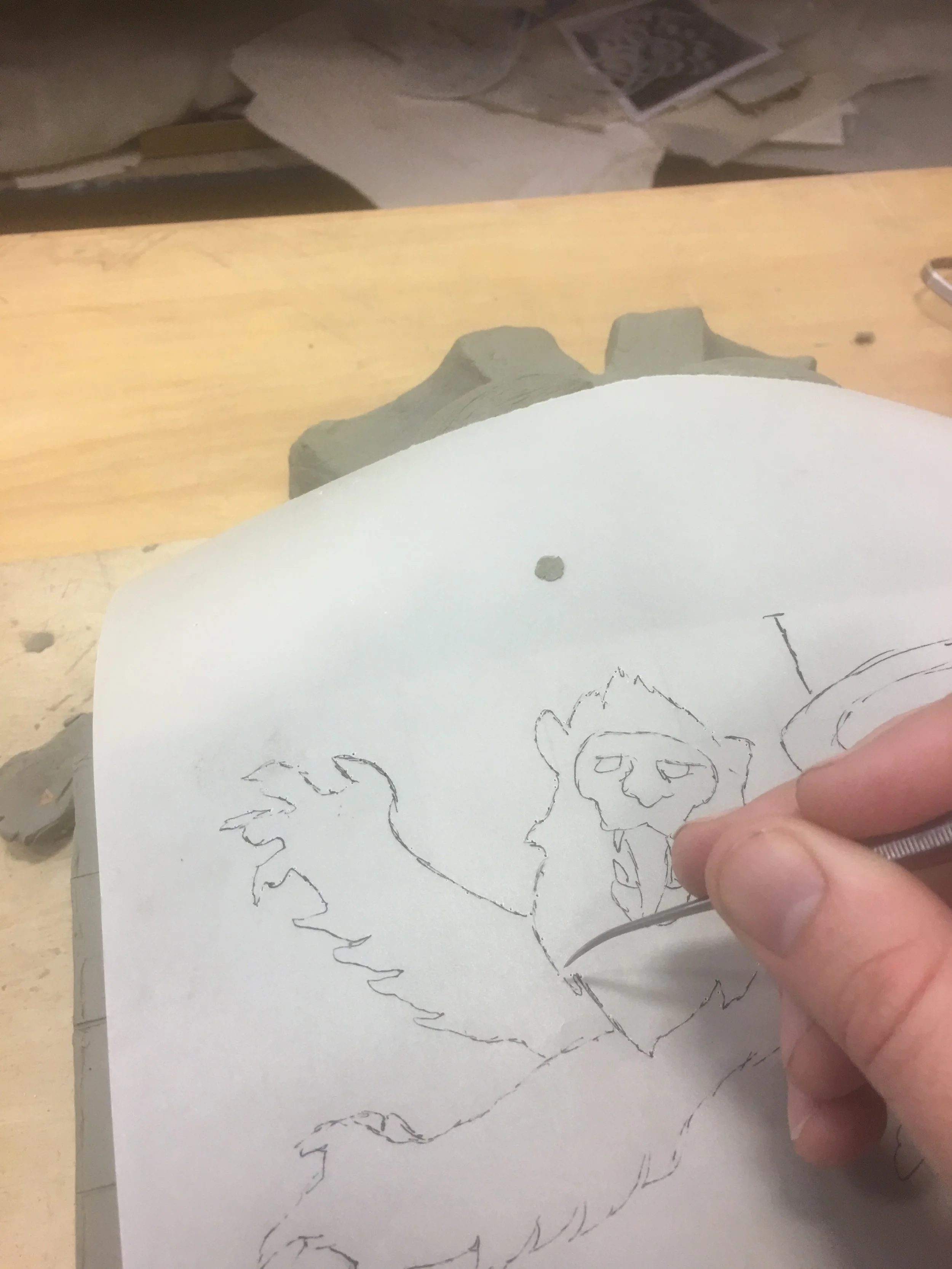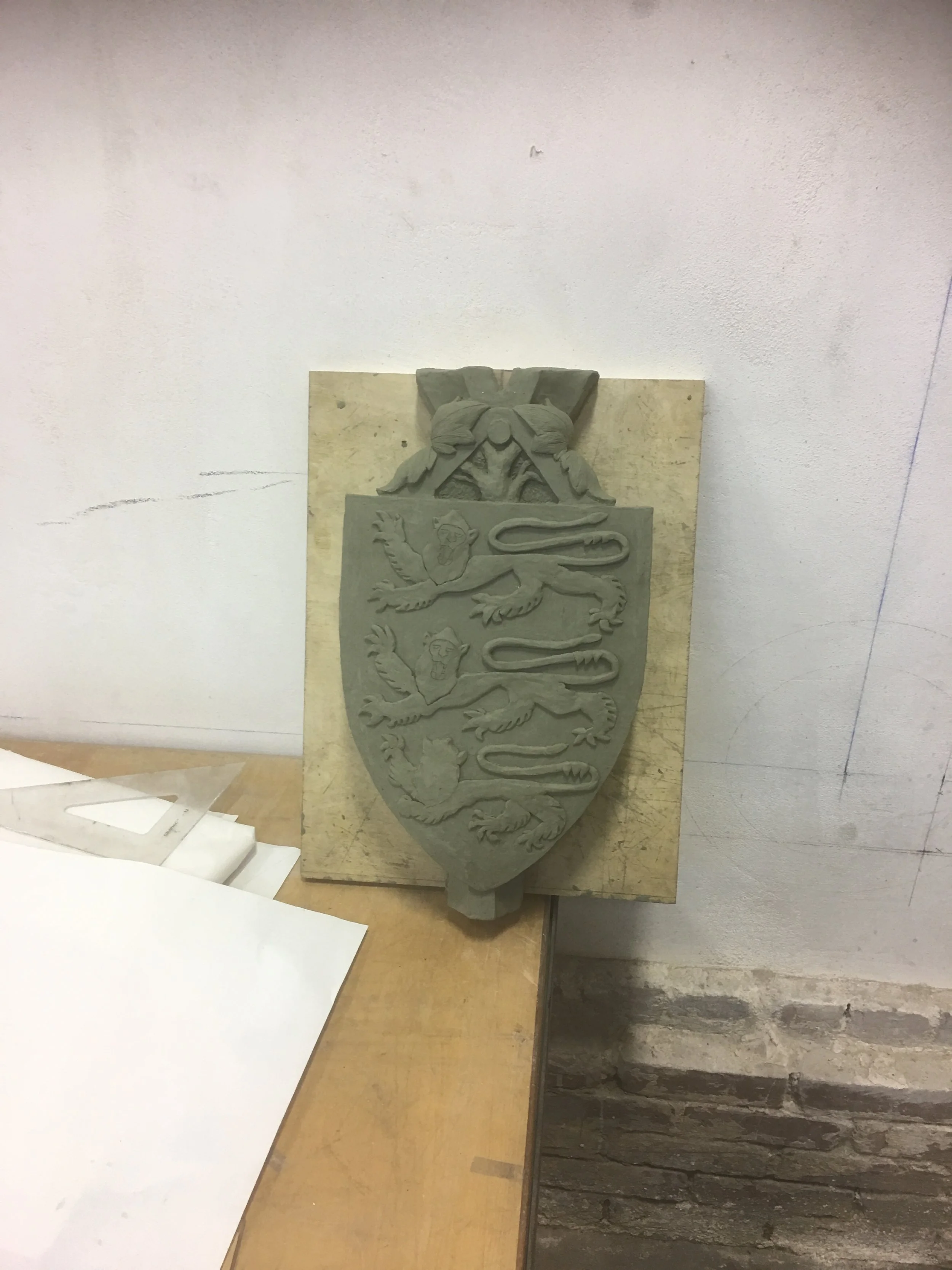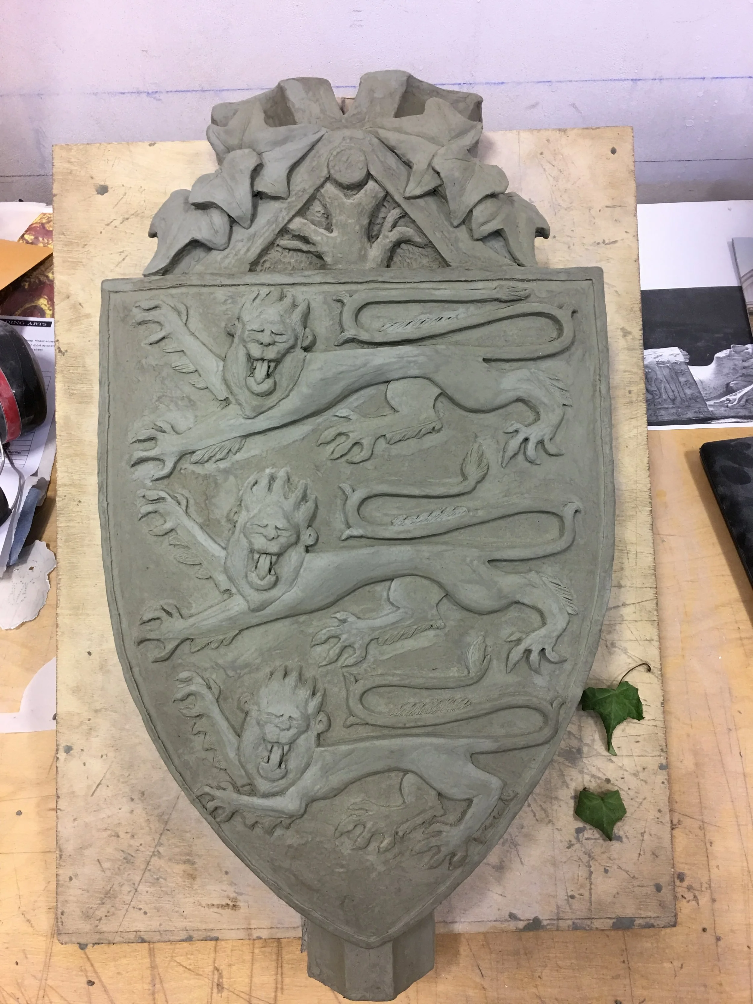 For this project I was assigned one of the three coat of arms shields for the Eleanor cross Project, the coat of arms representing England with three lions. After constructing the base for the sculpture last semester, this semester the goal is to finalize the lions themselves on the front of the shield. First a rough drawing was done to figure out the proportions and spacing and style of the lions, then a final scale drawing was done. After the drawing was complete a grid pattern was traced on to the shield to help with the spacing. Templates were then made and traced on to the clay, and then the rough forms of the lion were laid out in the clay. At this point the project is not completed, but the bottom lion is almost in a final state. The leaves on the top of the shield will also be passed over again before the project is complete.
