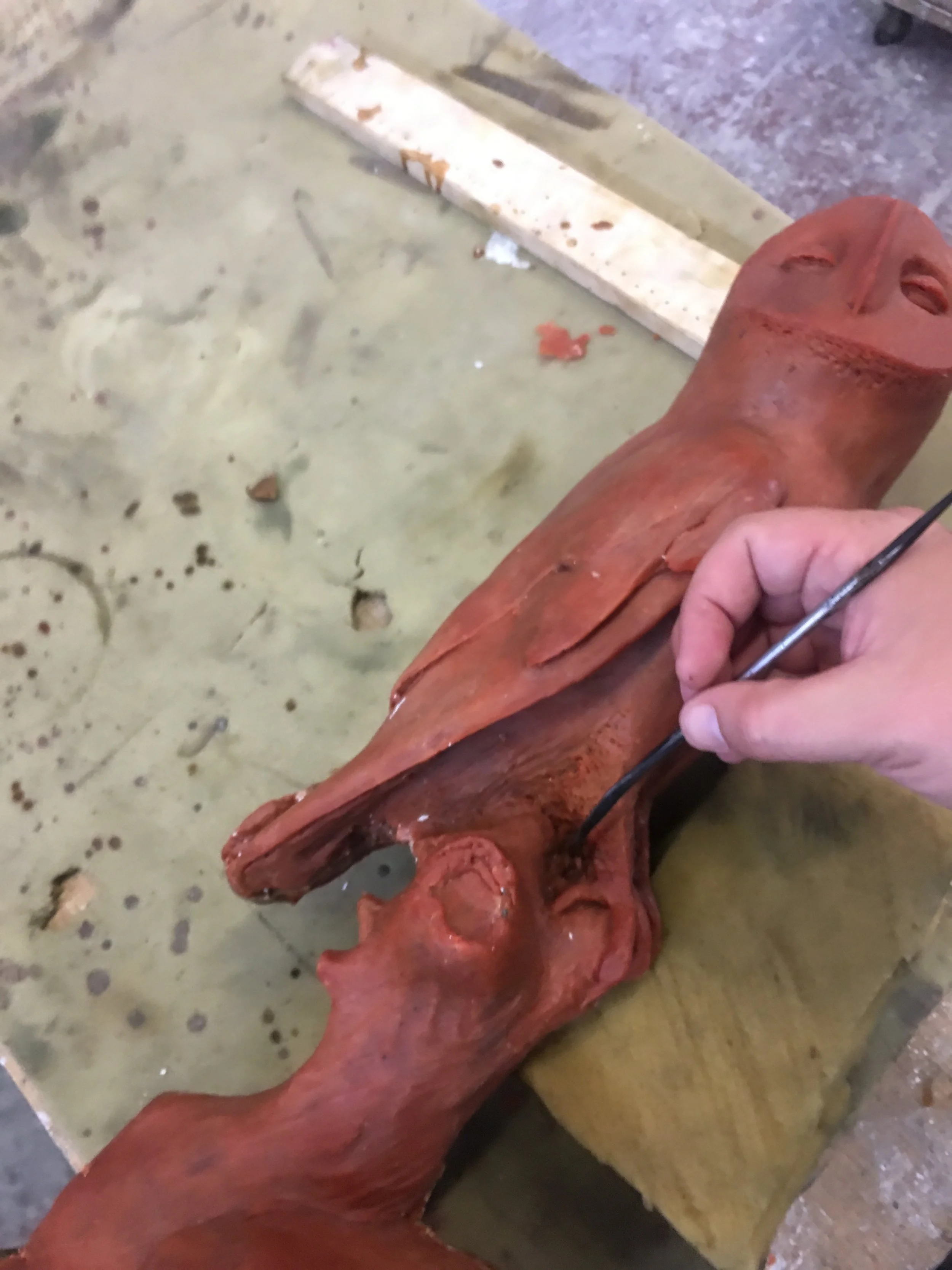 This week I would Travel to Art'U Foundry to do finishing on a wax model made from the mold I had contsructed earlier. These steps show how if you are going to be making a bronze, it is important to have a very good mould. The more work left unfinished during a mould making the more work you will have to do at the foundry cleaning up the wax cast. The plaster based mould that you have constructed will be sent to the foundry, where they will pour a 1/8 inch thick wax casting. the mould is then opened to reveal a wax cast of your original sculpture.