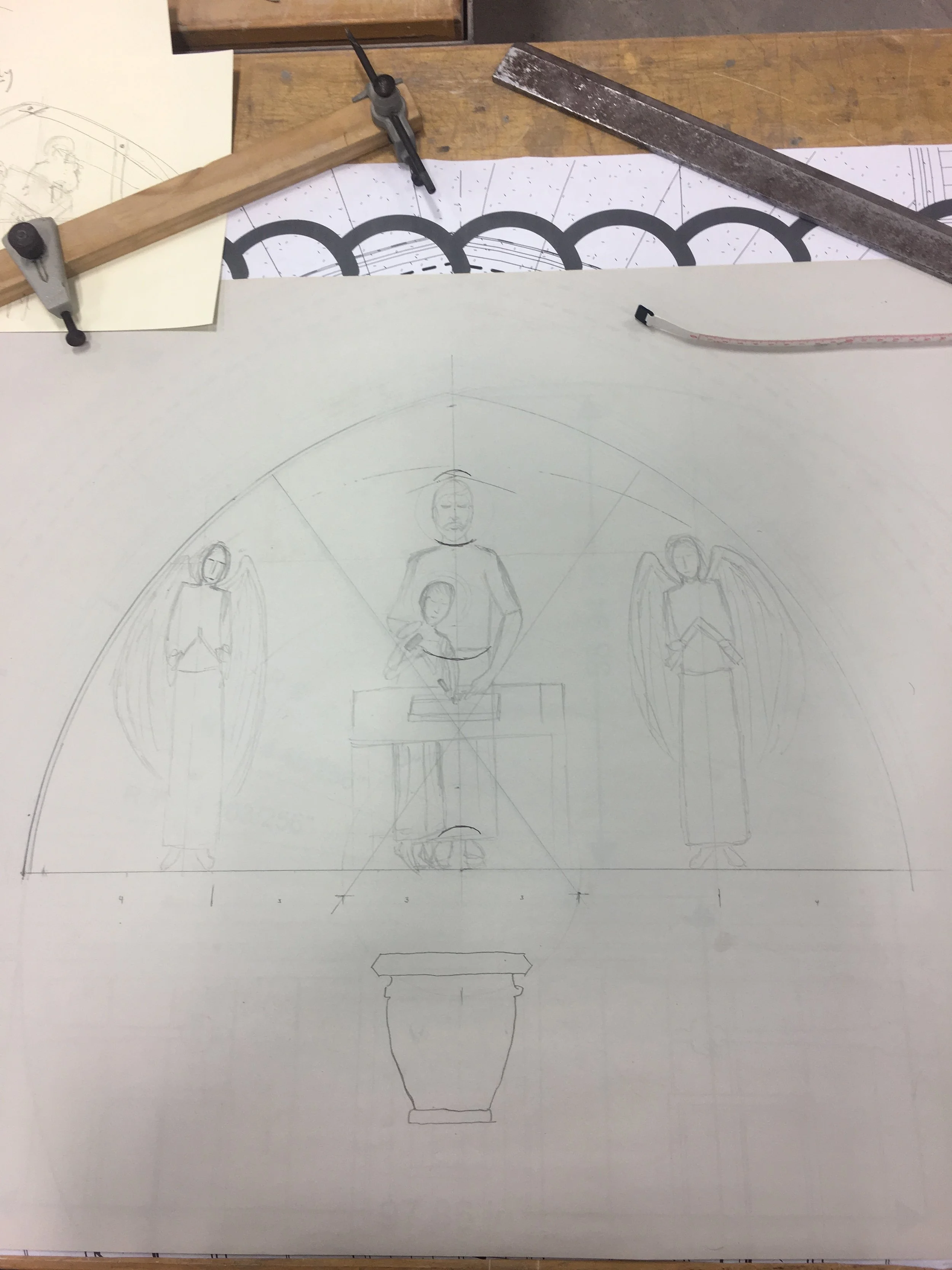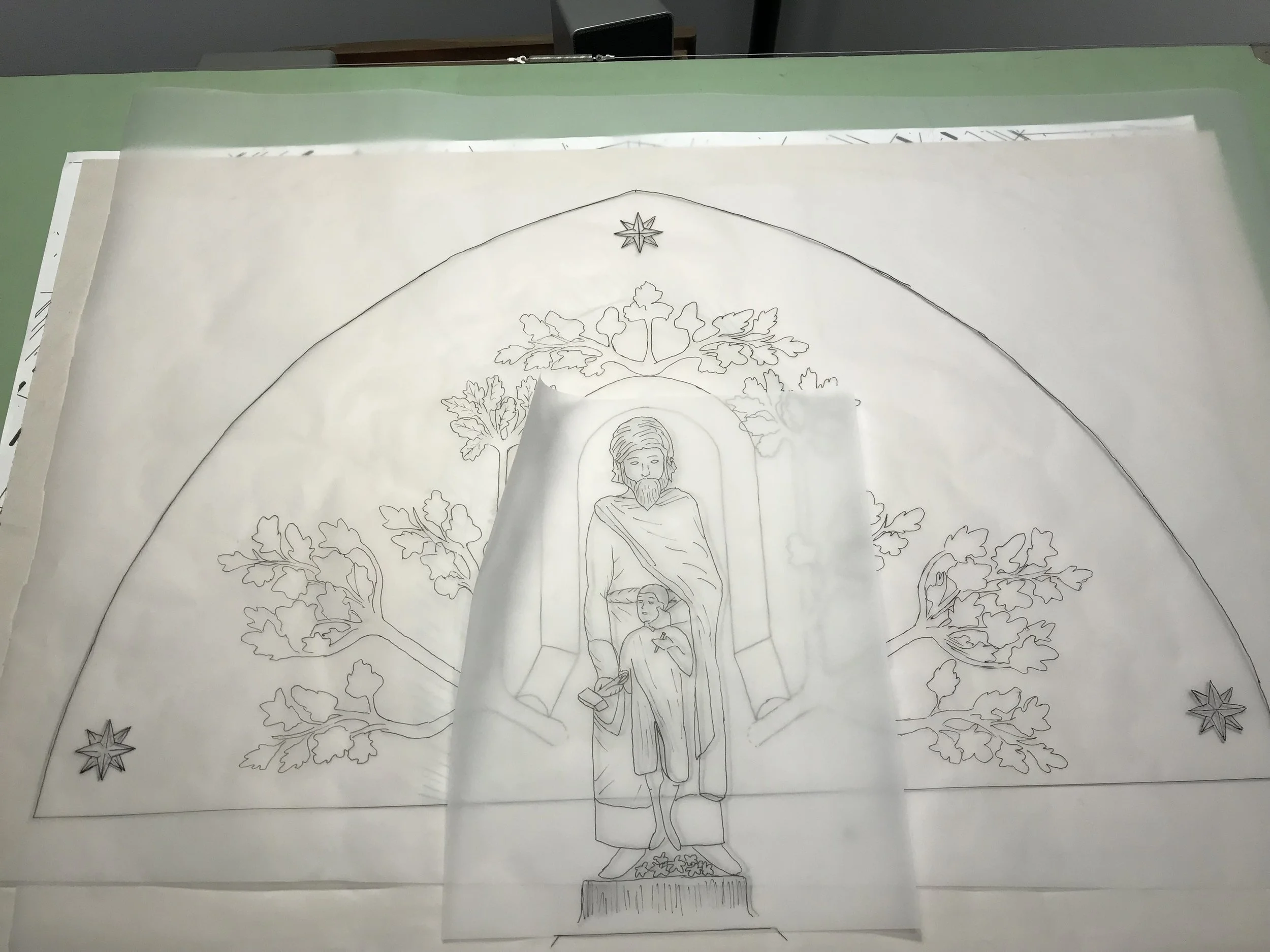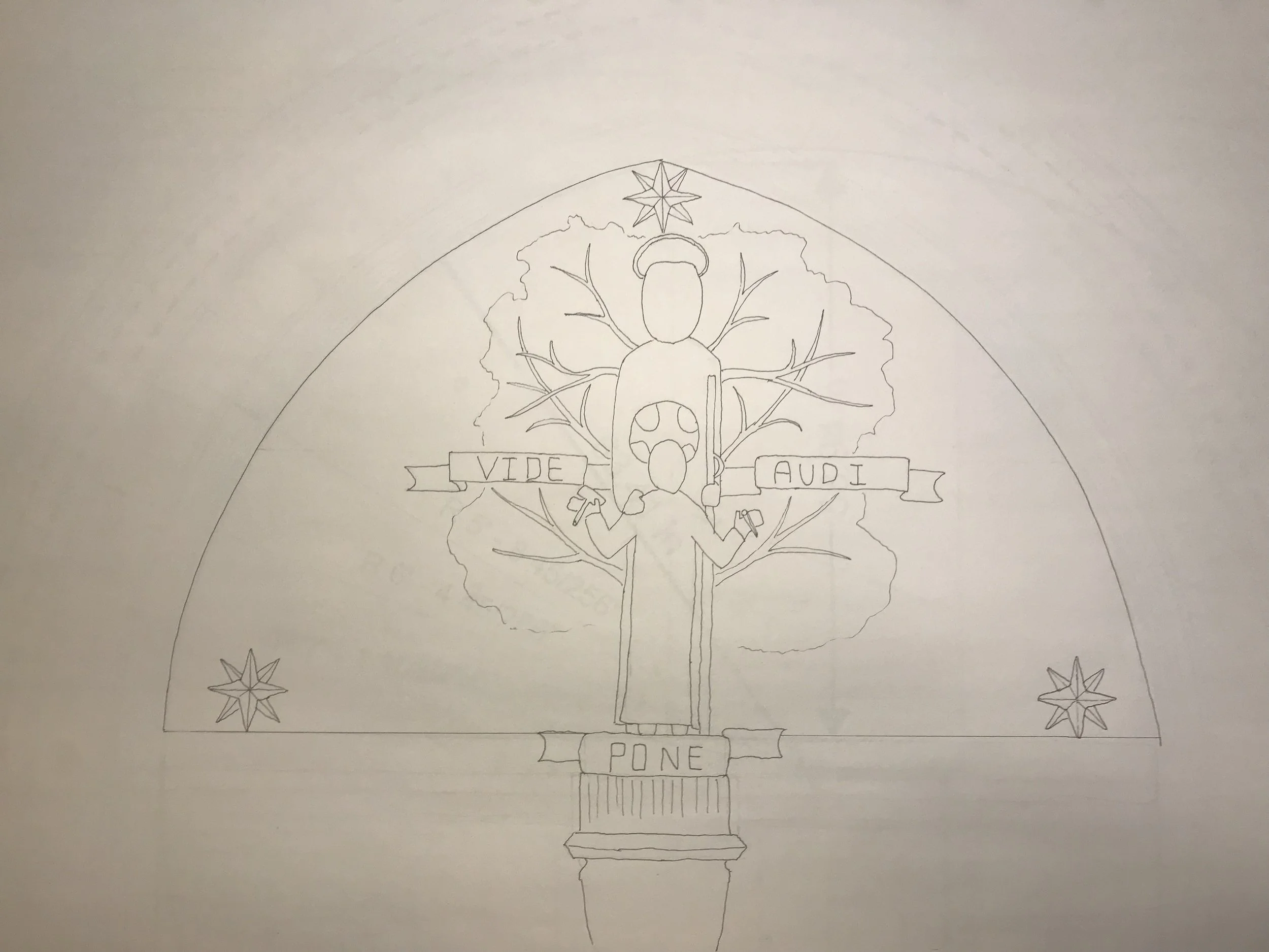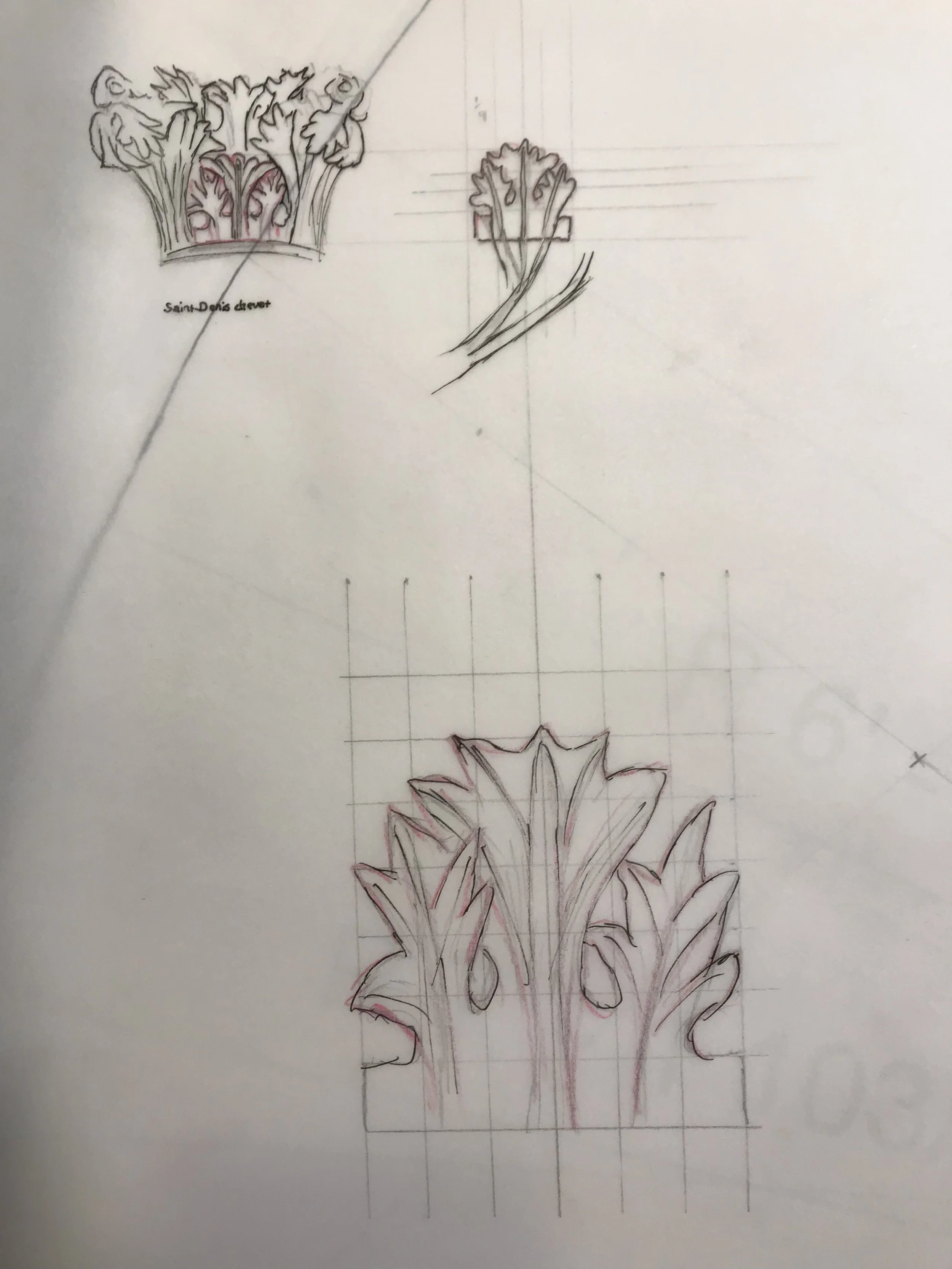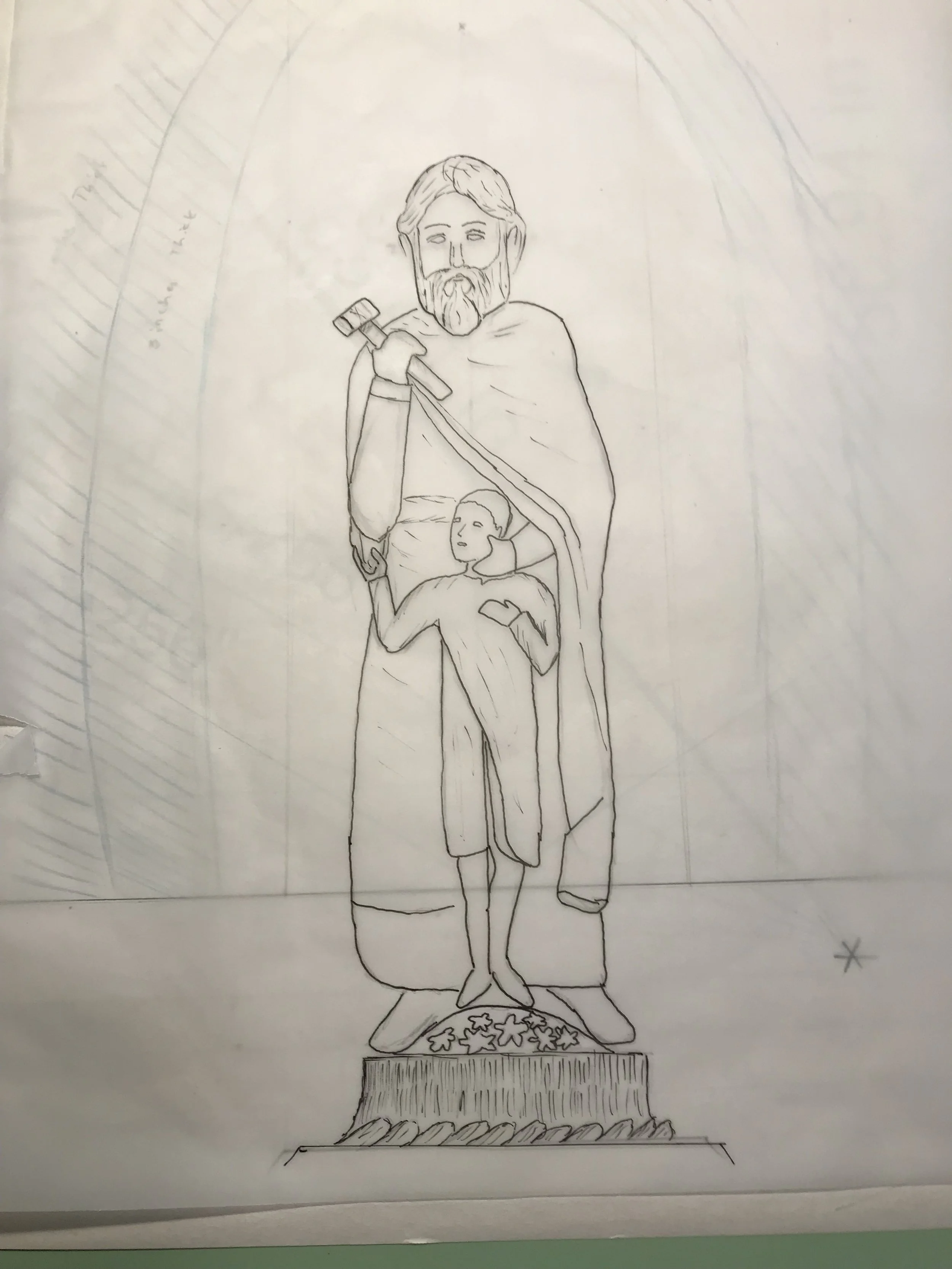For the background of the tympanum i would use branches of oak with strict proportions to try to give a balanced orderly scene. While the tympanum design I made was not ultimately chosen by the client, he did express interest in the central sculpture design. I would complete this sculpture in Italy the month after graduation from ACBA.