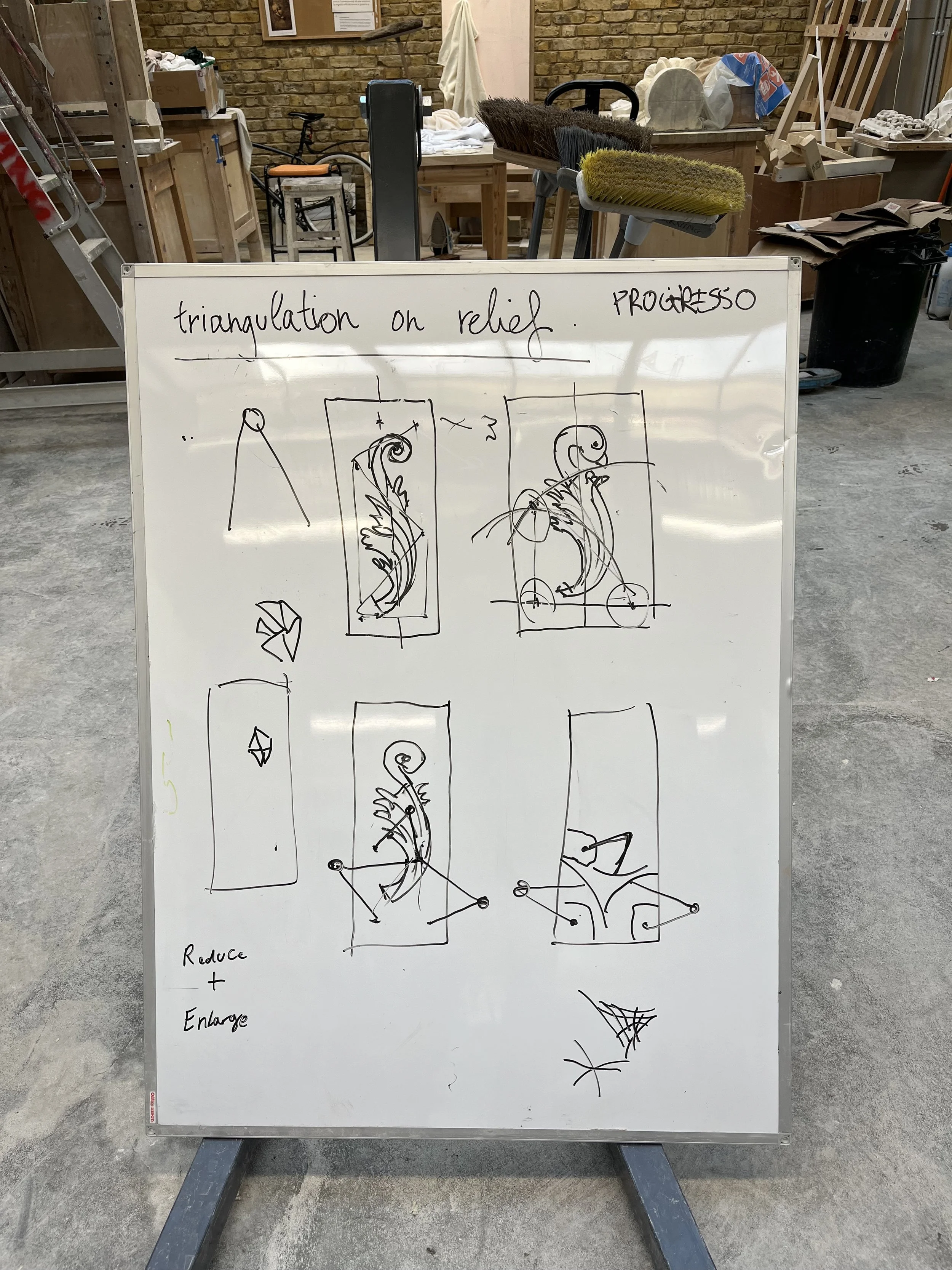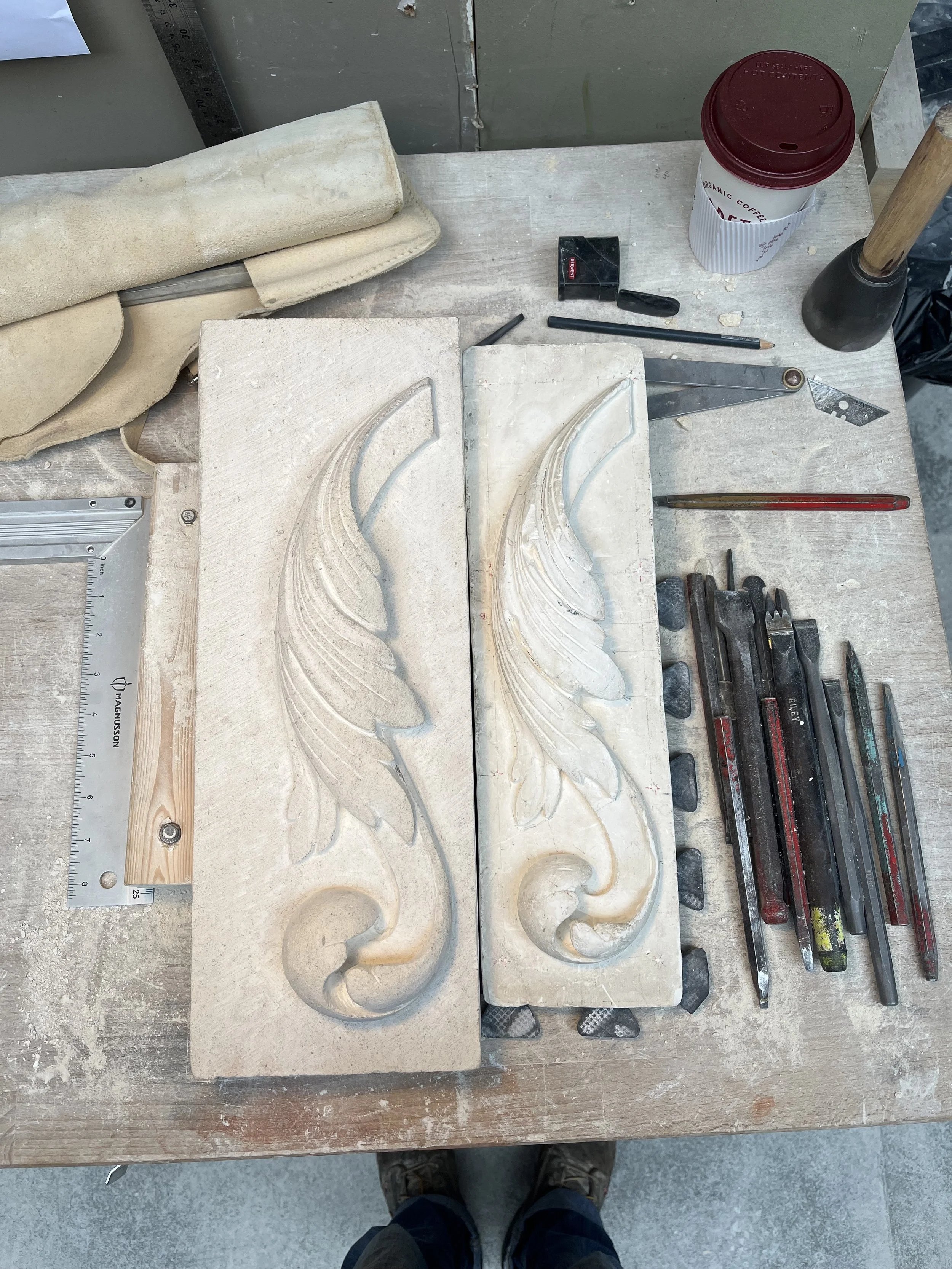 In this photo the 3 compass triangulation can clearly be seen. Here I am trying to find the correct depth of the third leaf. The two marks close by each other show it is the right location on the plane, but the third compass is blocked by the excess stone from reaching the other two points. This indicates that more stone must be removed from that area so the third compass can join the other two.