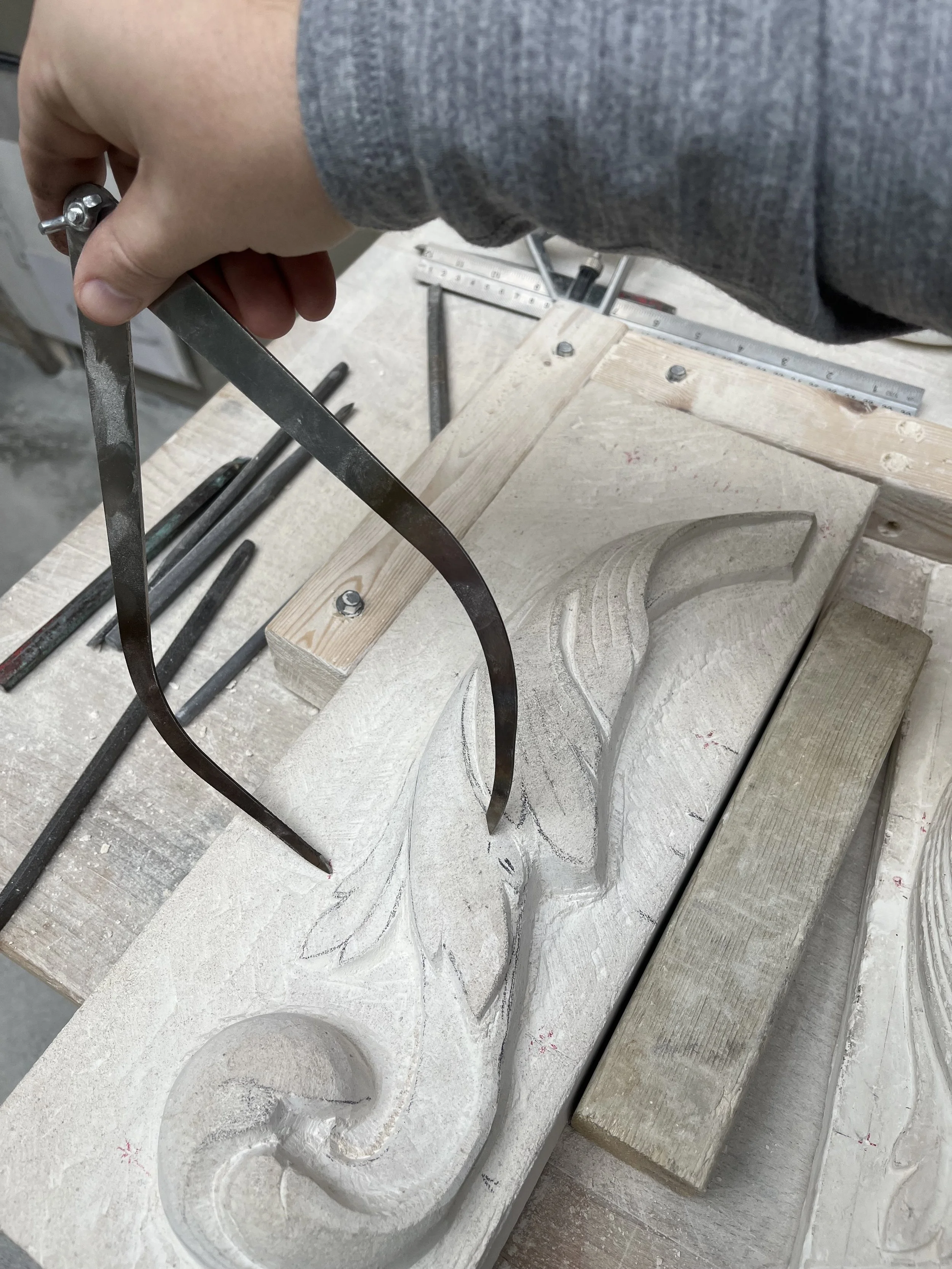 Middle Process: After spending time marking out the high points with the three compass triangulation and creating the grid along the edge, the next step was to work carefully to cut down the shape to the right height. This process took me more time then it should have, but for me as this was my first major carving project i was very conservative in removing material, I was also getting used to each type of chisel and the different effects that could be used in carving with them. There were interesting lines and flutes running along the spine of the acanthus, for these I used a small bullnose chisel, and a small lettering chisel to do a v cut running along the lines. The natural light that entered the workshop in late afternoon was very helpful so I made sure to take pictures of details at that time.