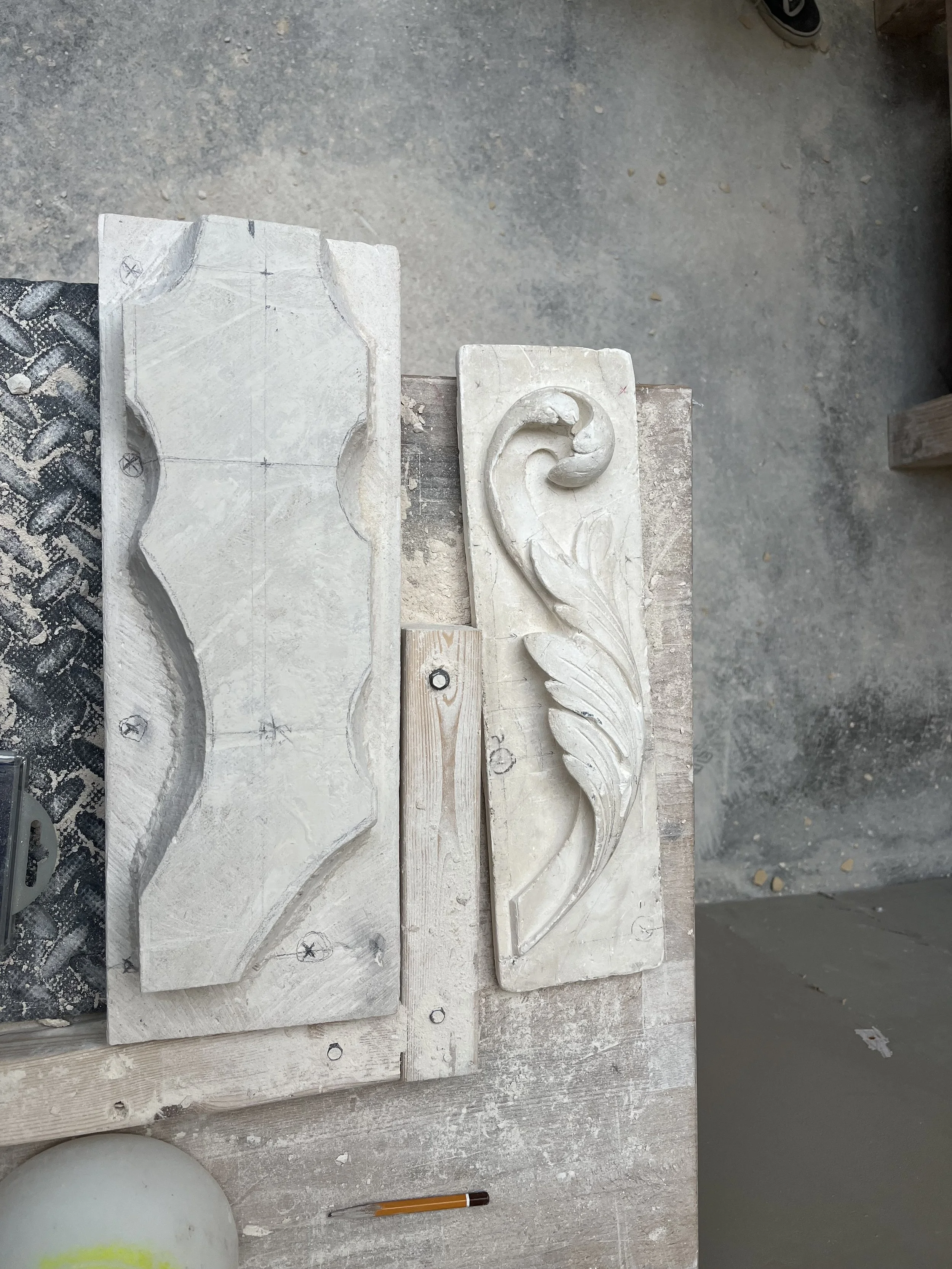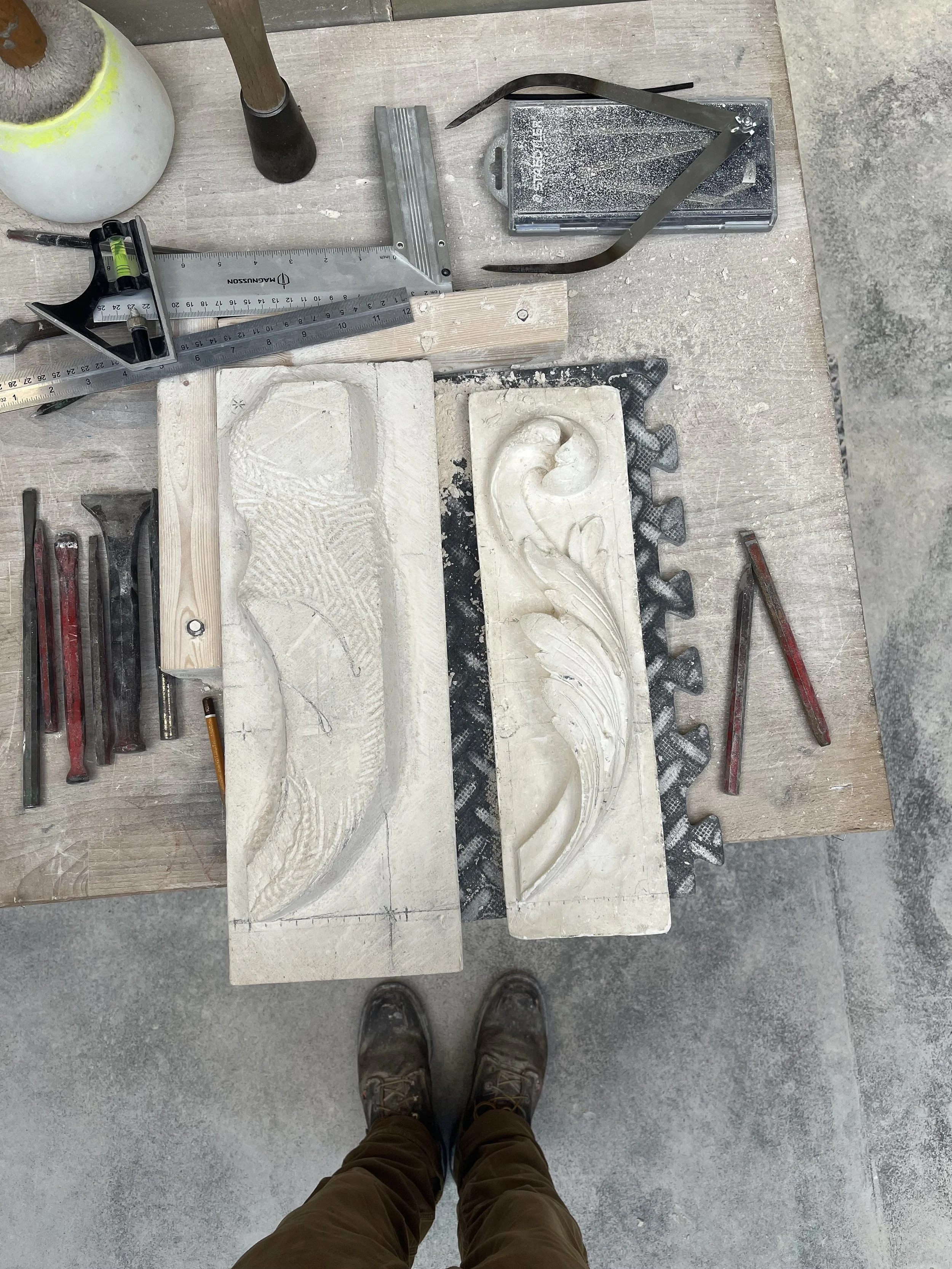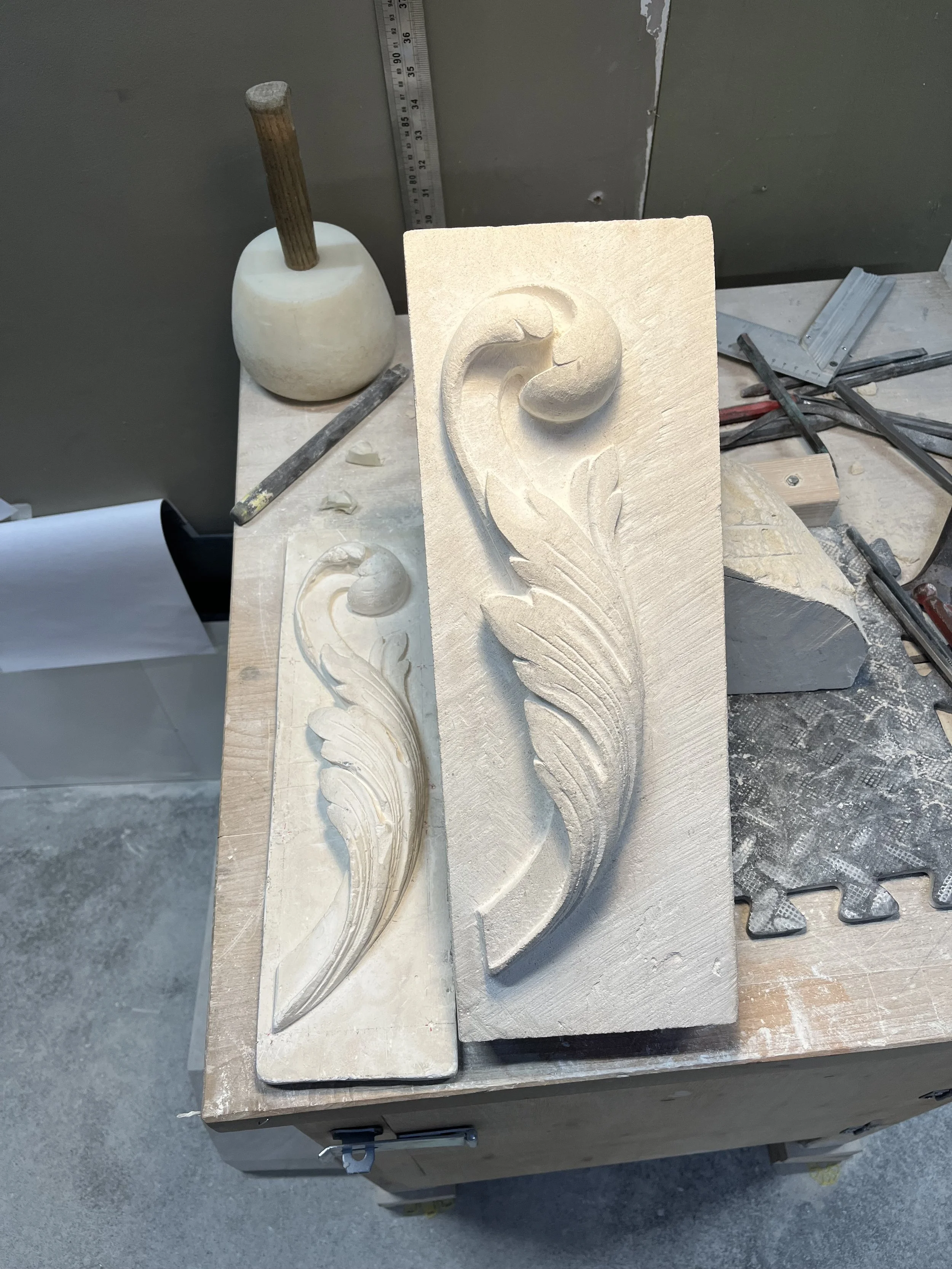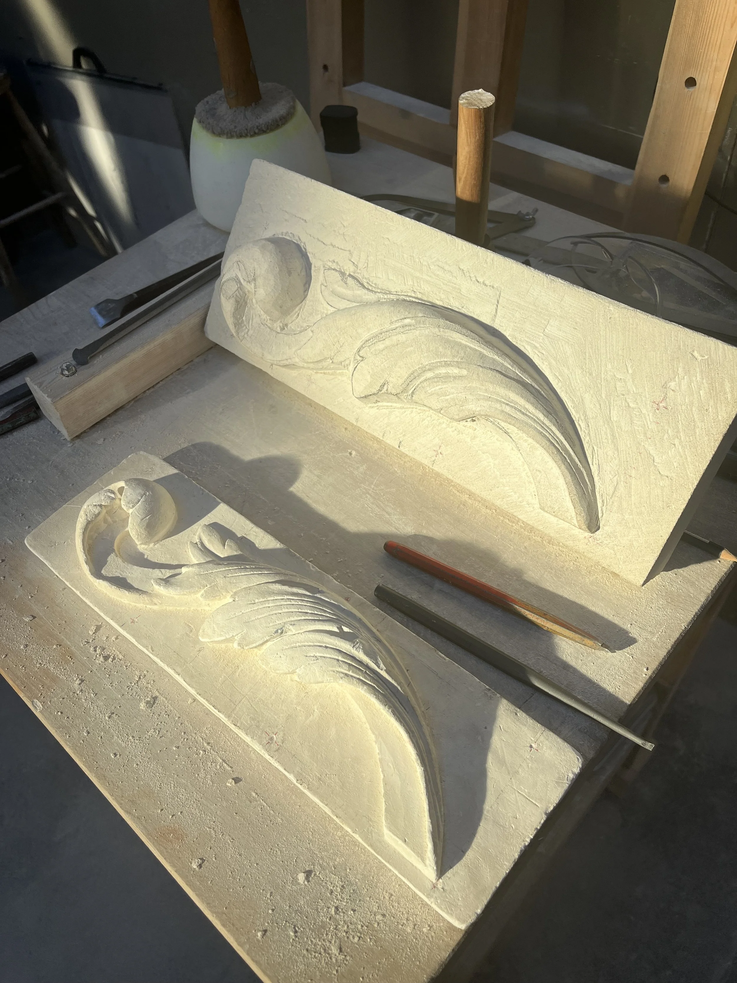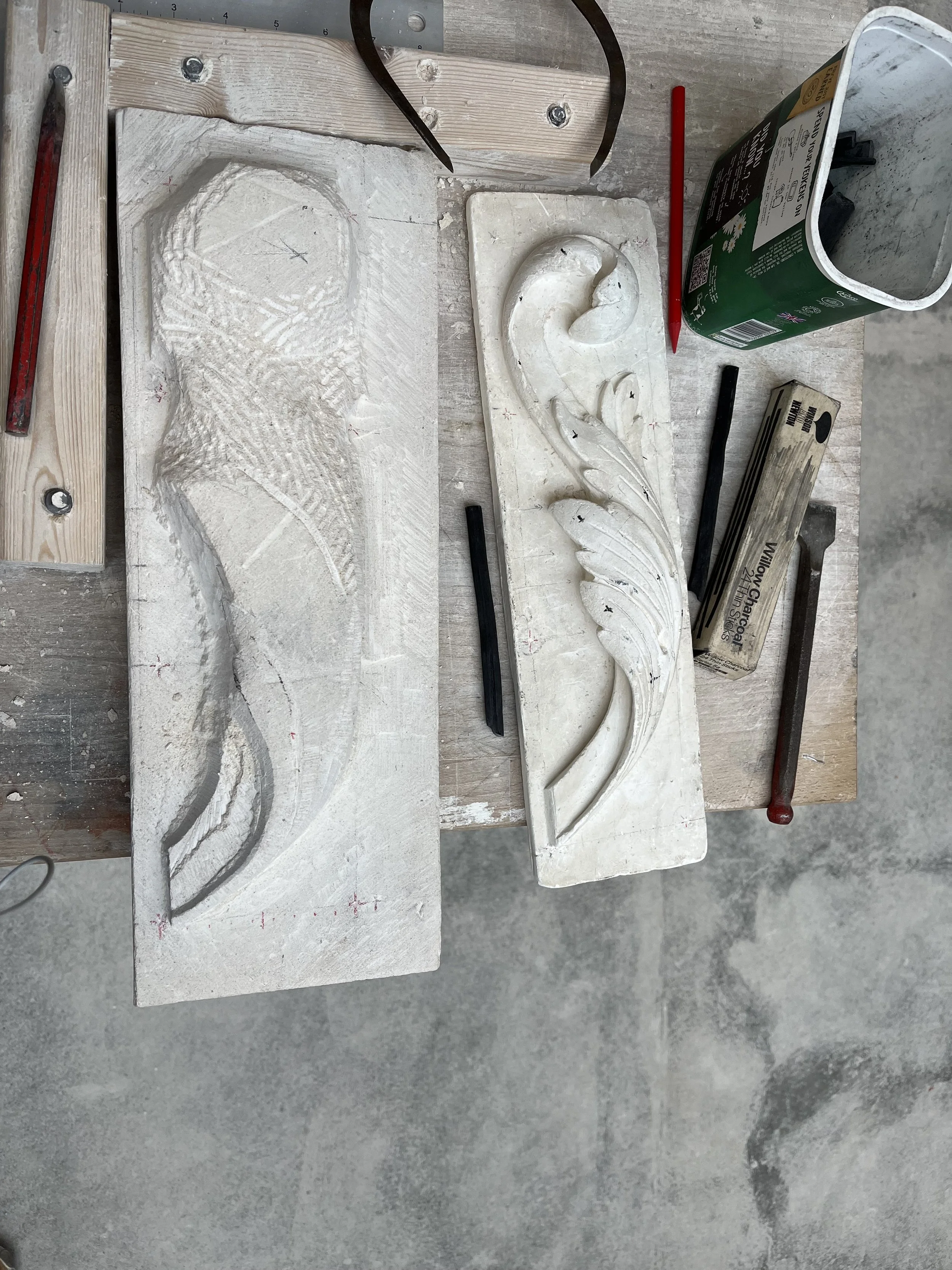 Starting Process: Once the block was cut the first objective was to draw out areas that are obviously wide of the acanthus. Once the areas are identified they are blocked out and removed leaving a rough shape of the final carving.