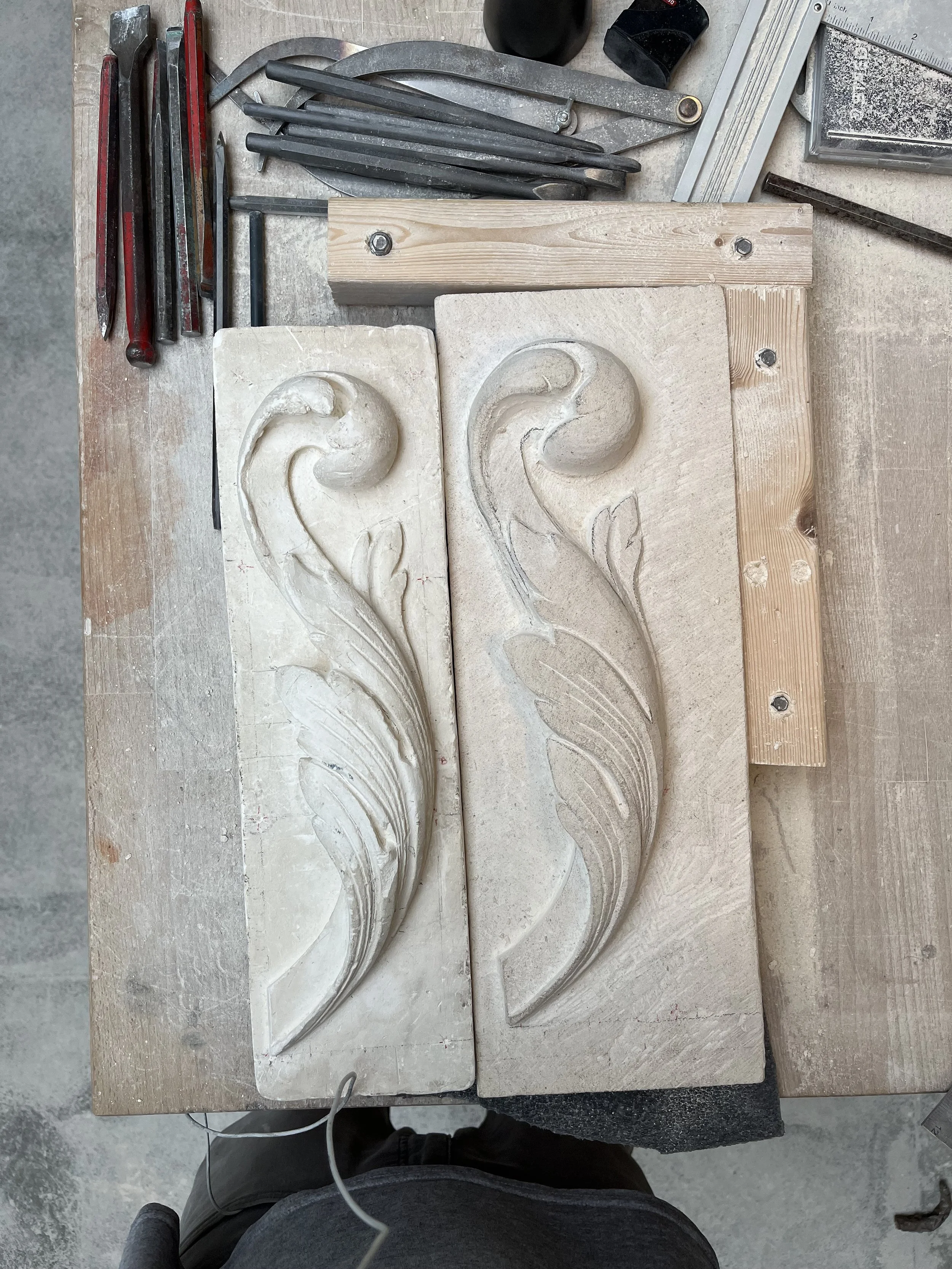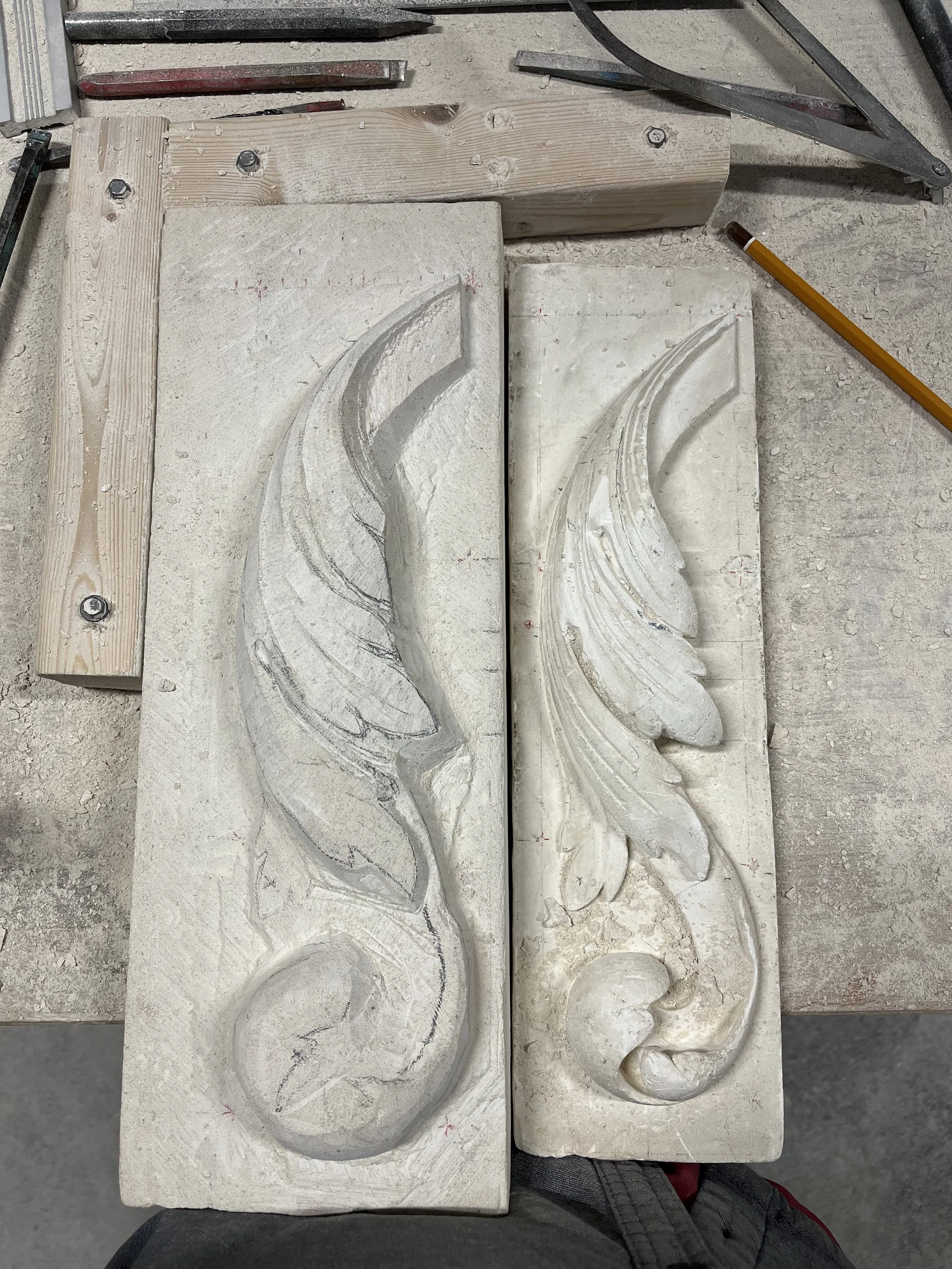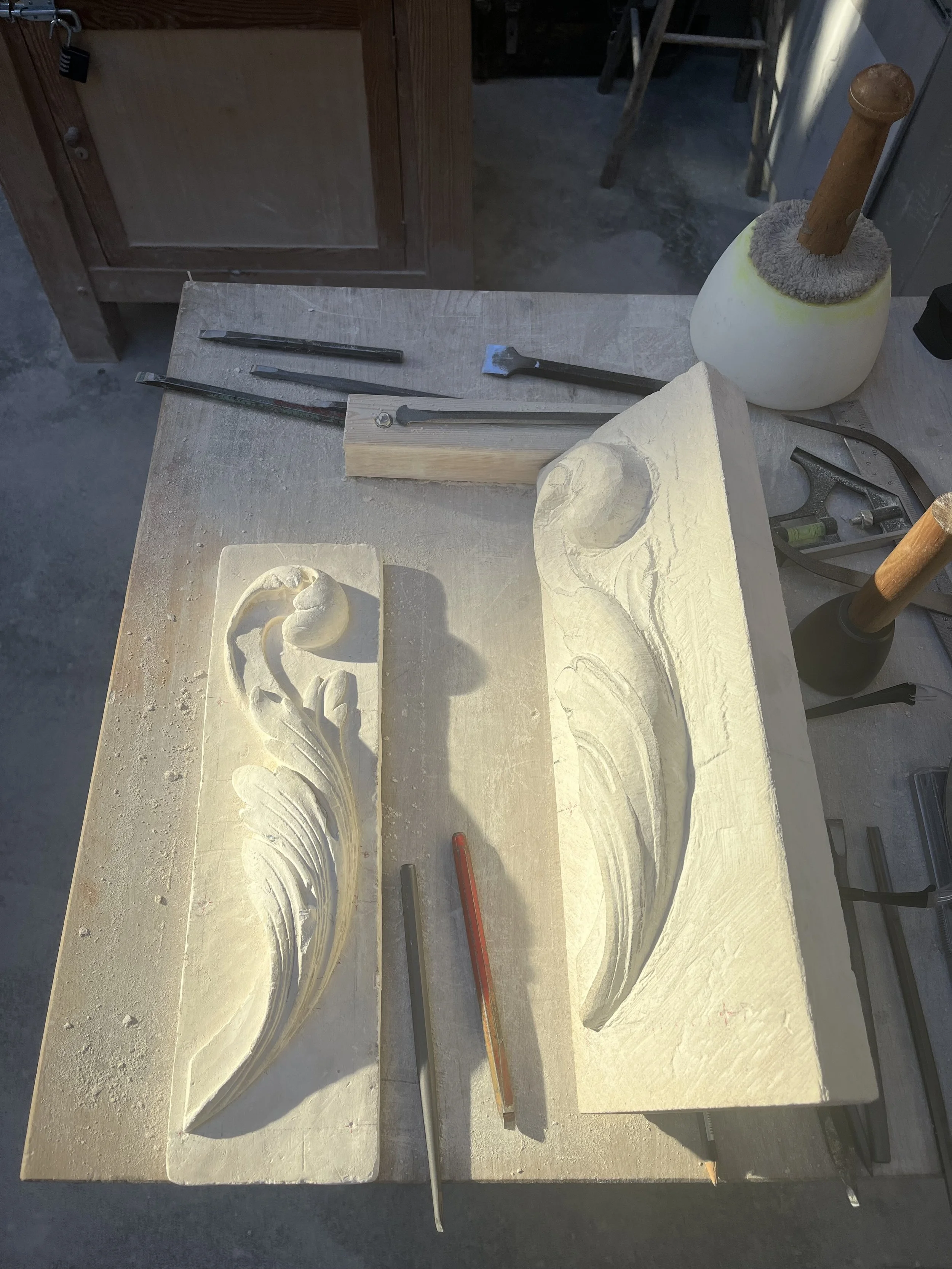 Overview: The objective of this project was to gain experience on carving an acanthus leaf, and to become familiar with the process of finding points in space with the triangulation method. The project was to be completed within 10 days and should accurately portray the acanthus as shown on the plaster model we were given. The acanthus is a very common historical motif and is frequently encountered in carving and modeling.