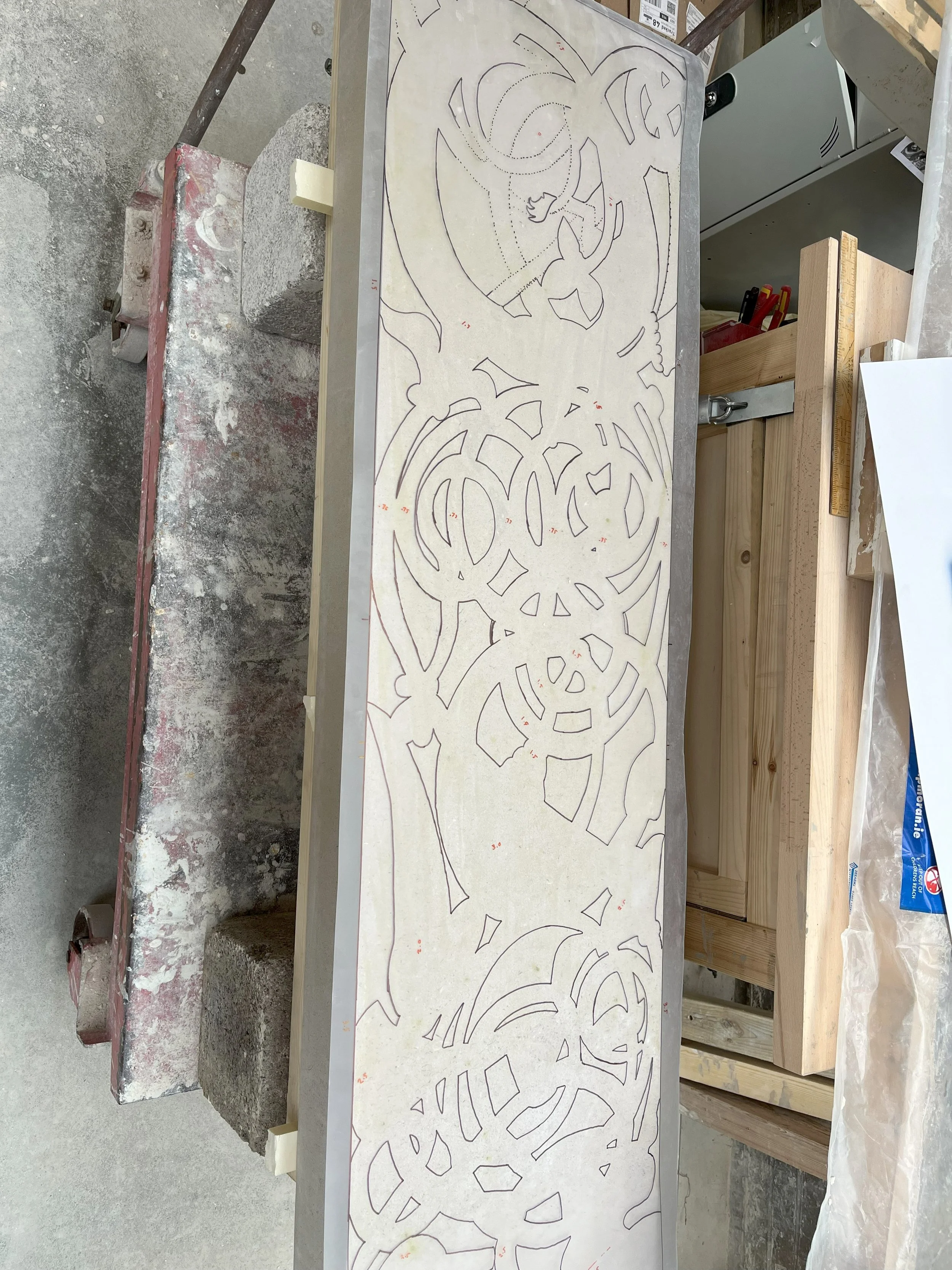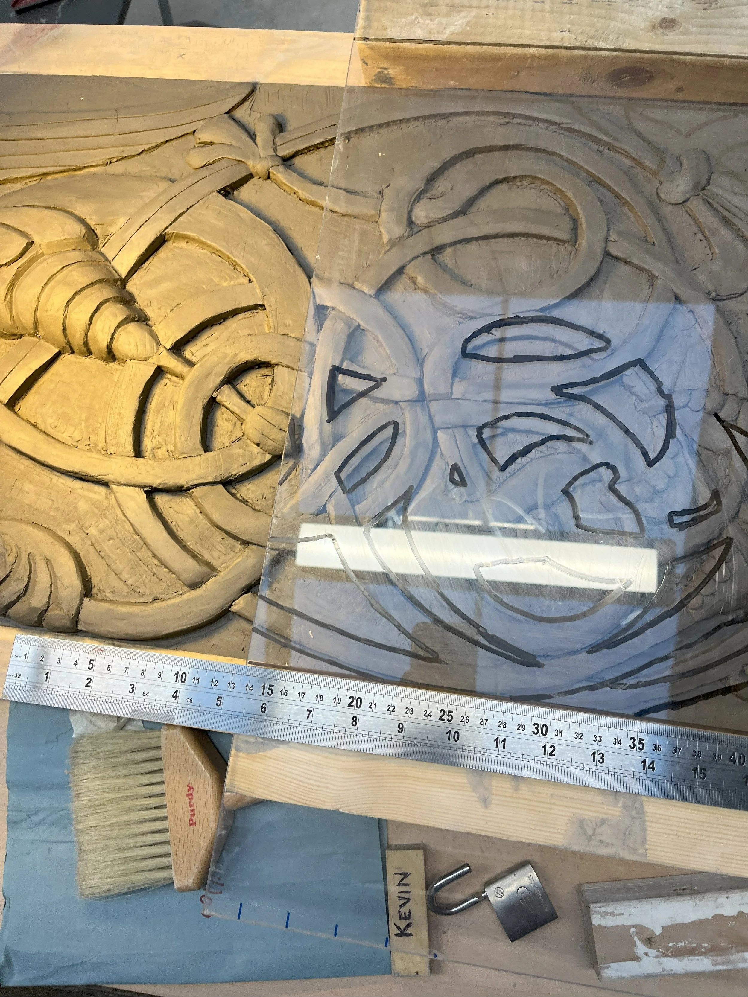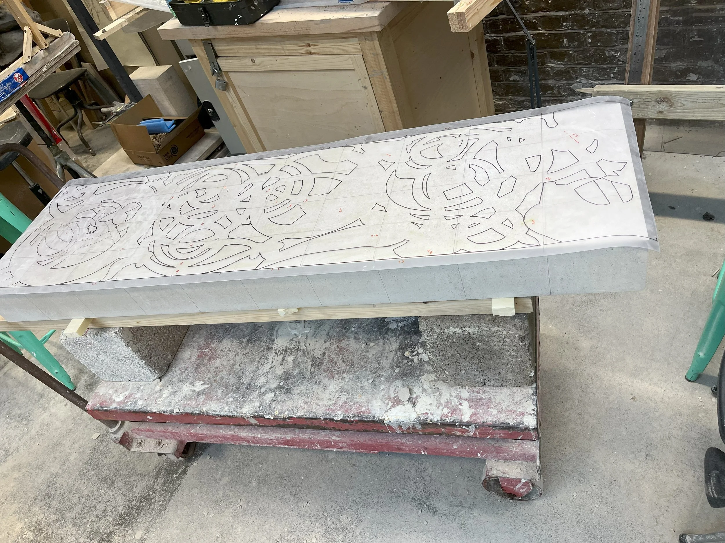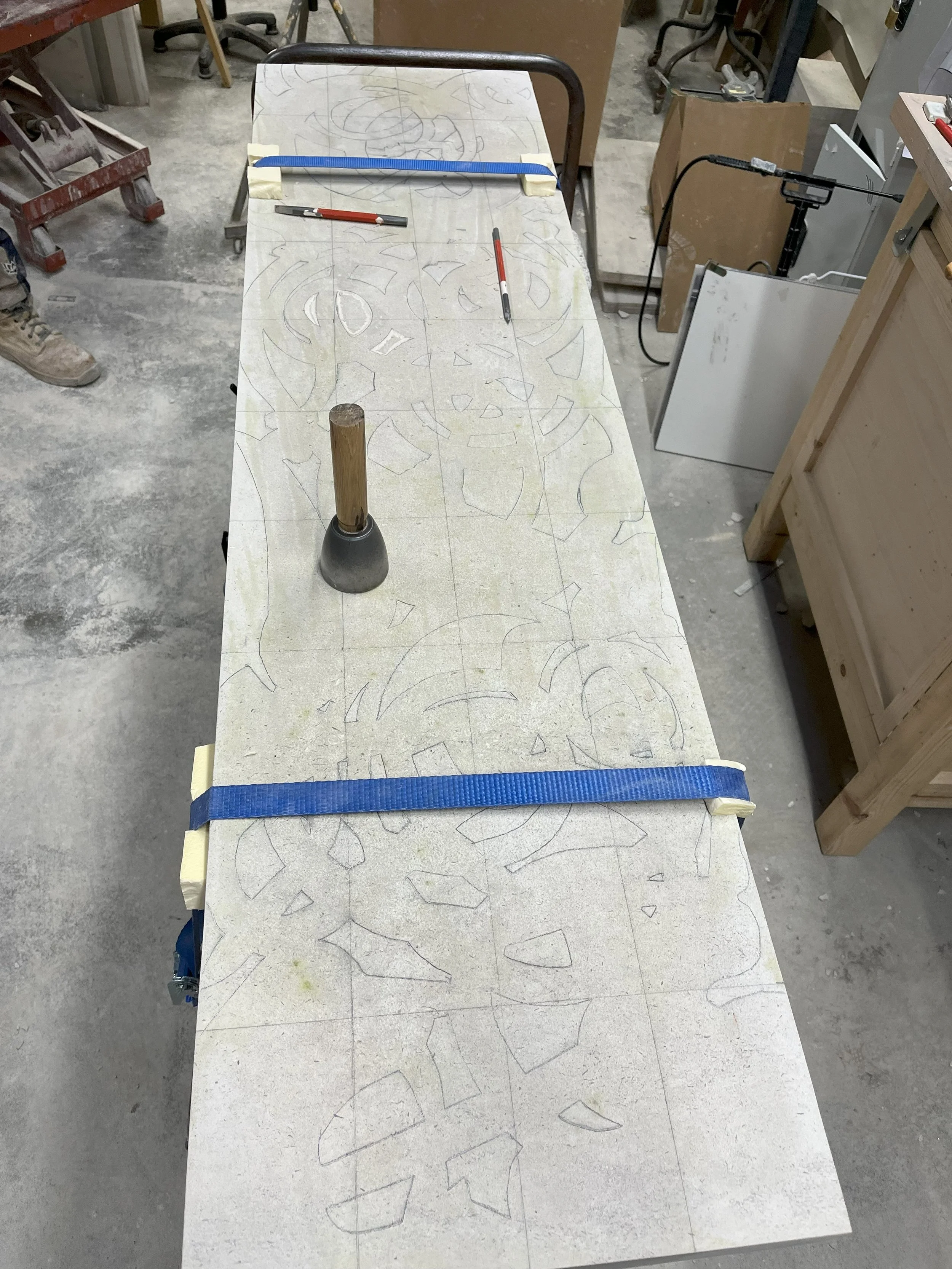 After construction of the clay model, It was decided to skip the casting stage and move directly to preparing the stone for carving. Changes and adjustments that had been made in the clay model would need to be mapped with a new template. After the template is applied it is drawn on the stone and traced in with a point. Then void spaces are mapped out and drill guide holes are set for the router use that will come later.