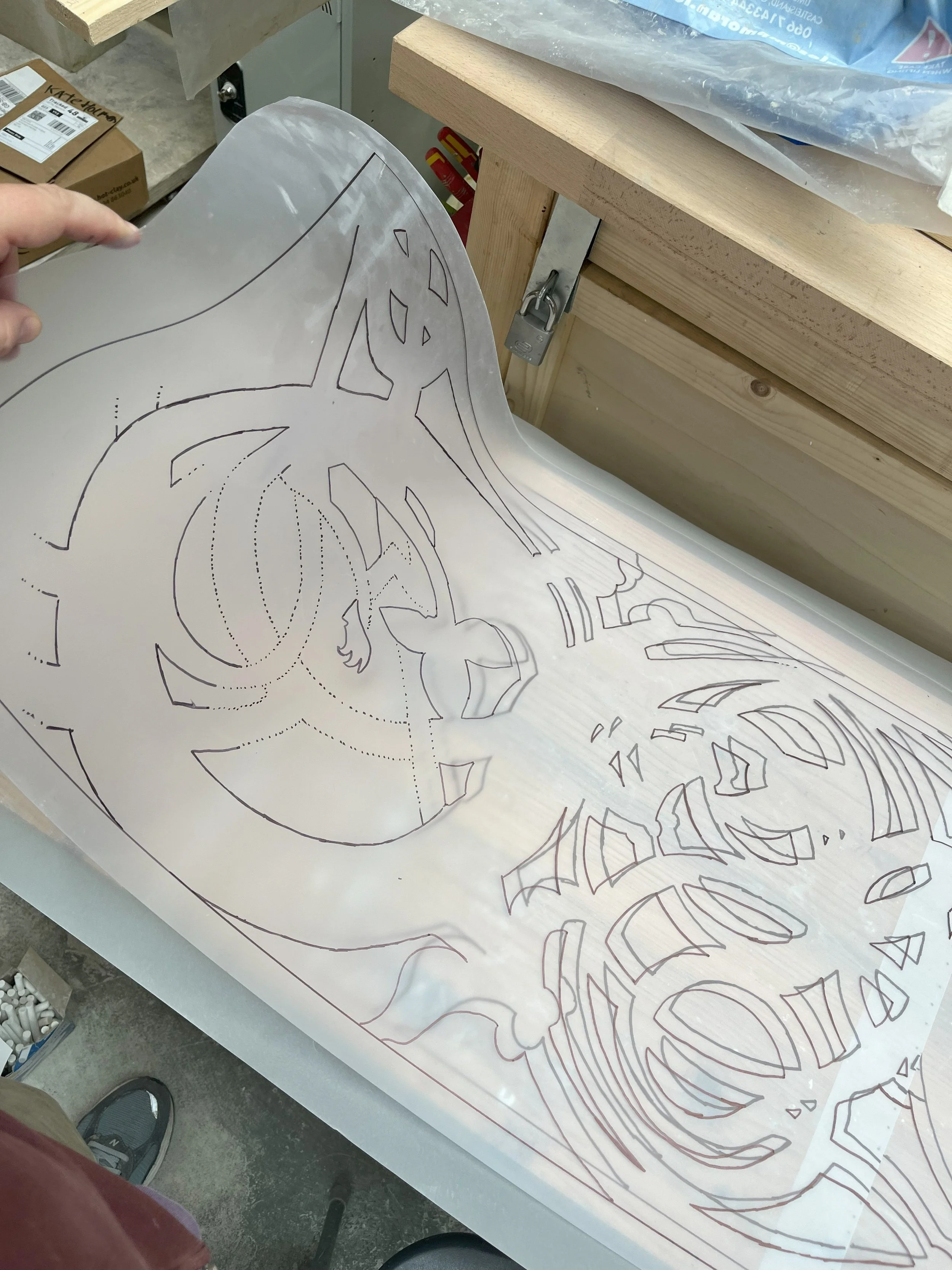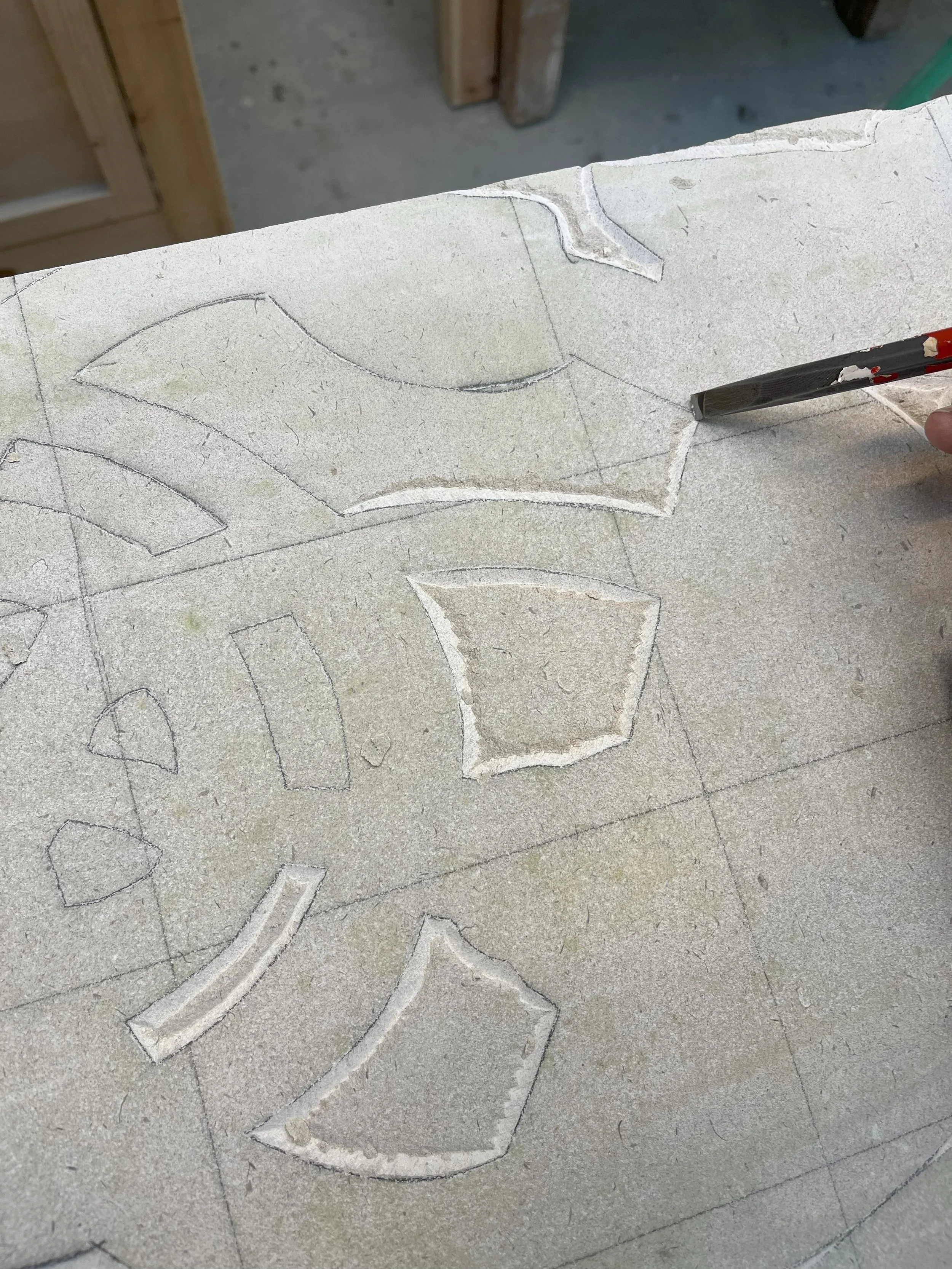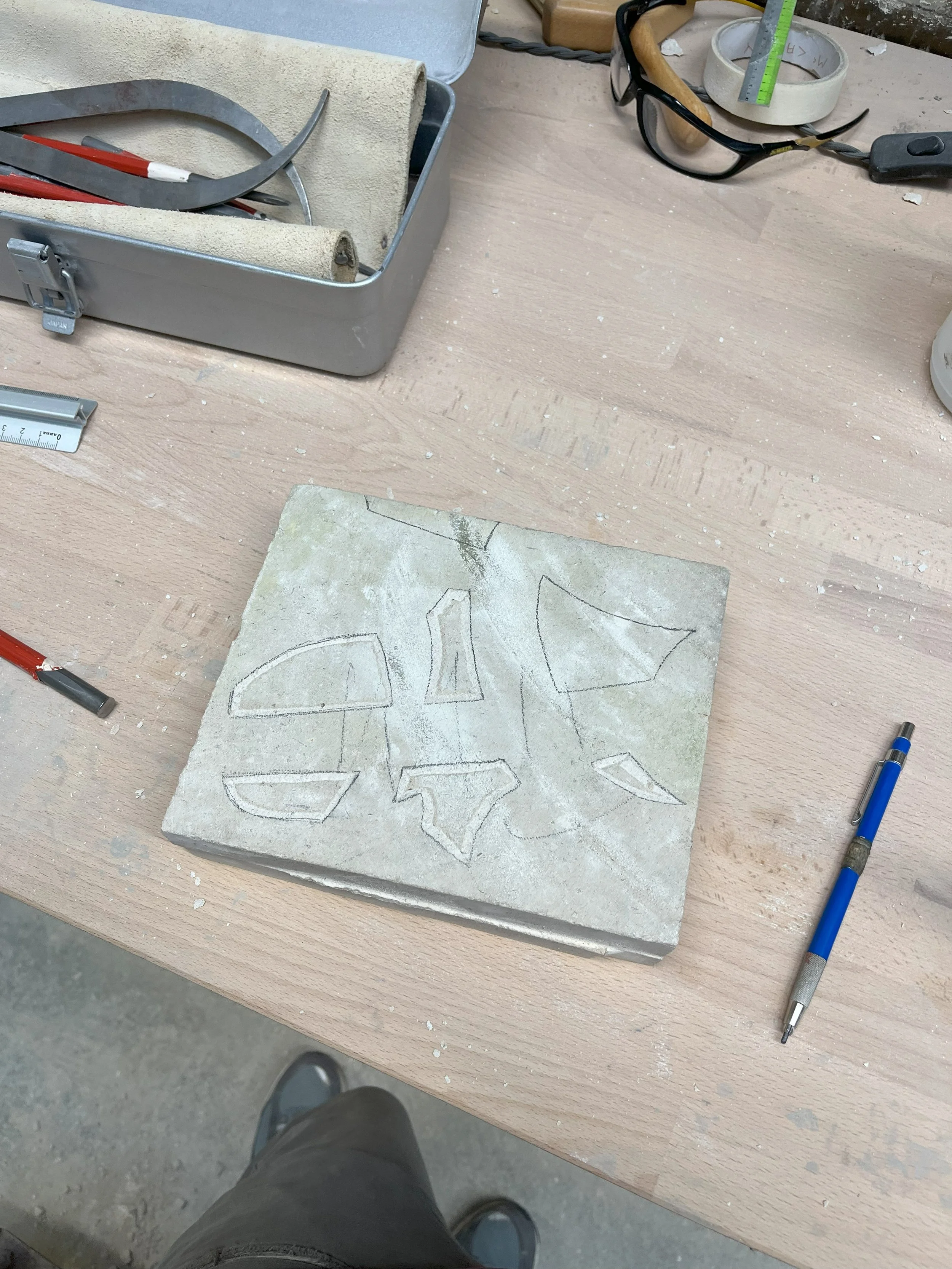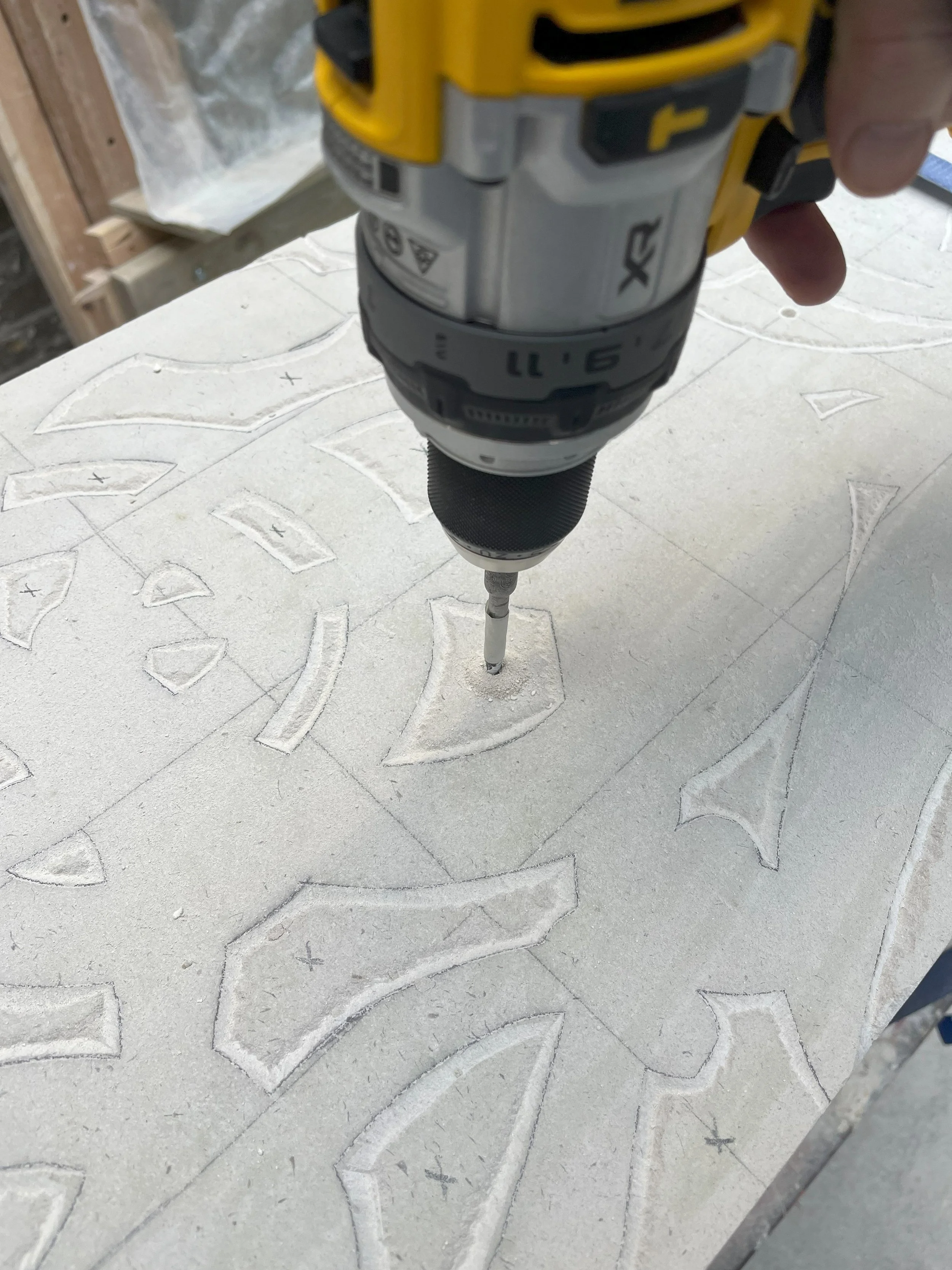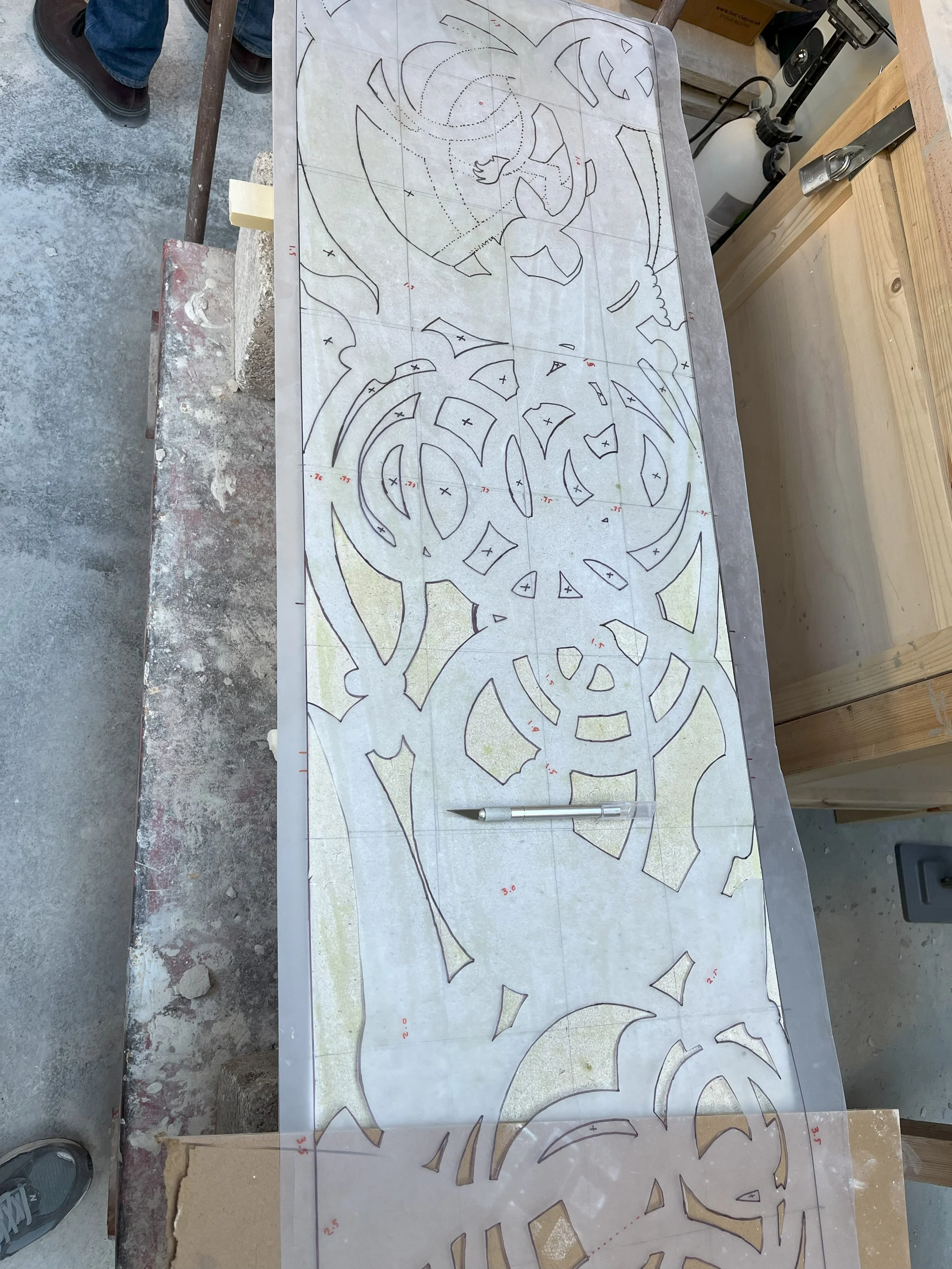 After construction of the clay model, It was decided to skip the casting stage and move directly to preparing the stone for carving. Changes and adjustments that had been made in the clay model would need to be mapped with a new template. After the template is applied it is drawn on the stone and traced in with a point. Then void spaces are mapped out and drill guide holes are set for the router use that will come later.