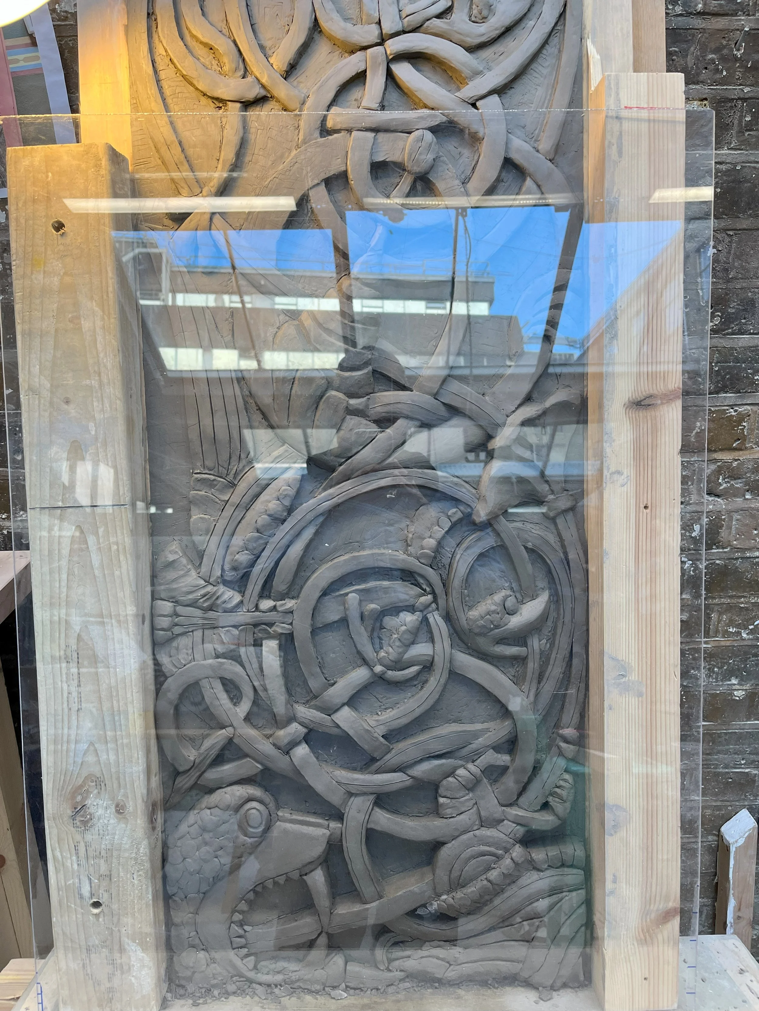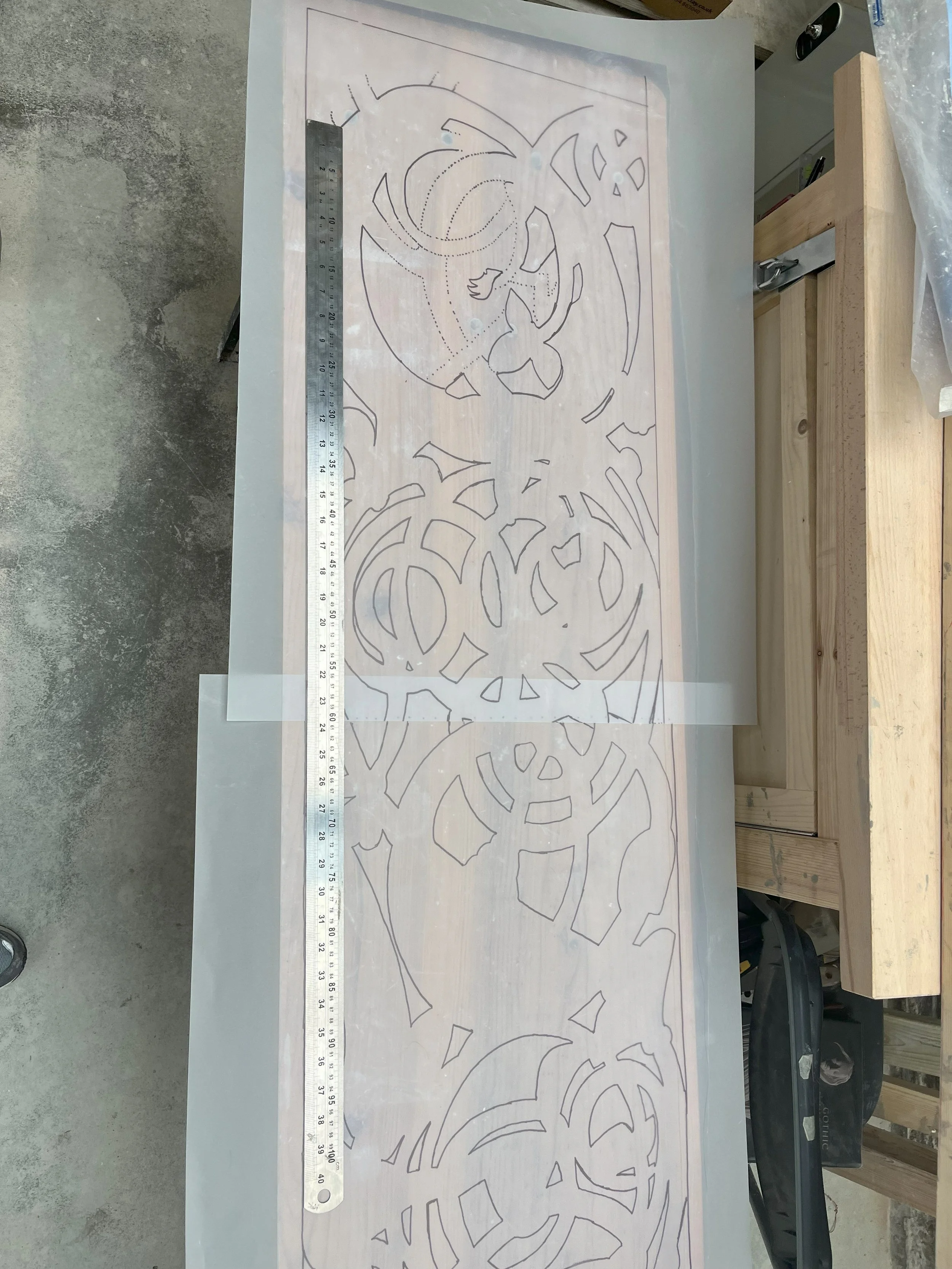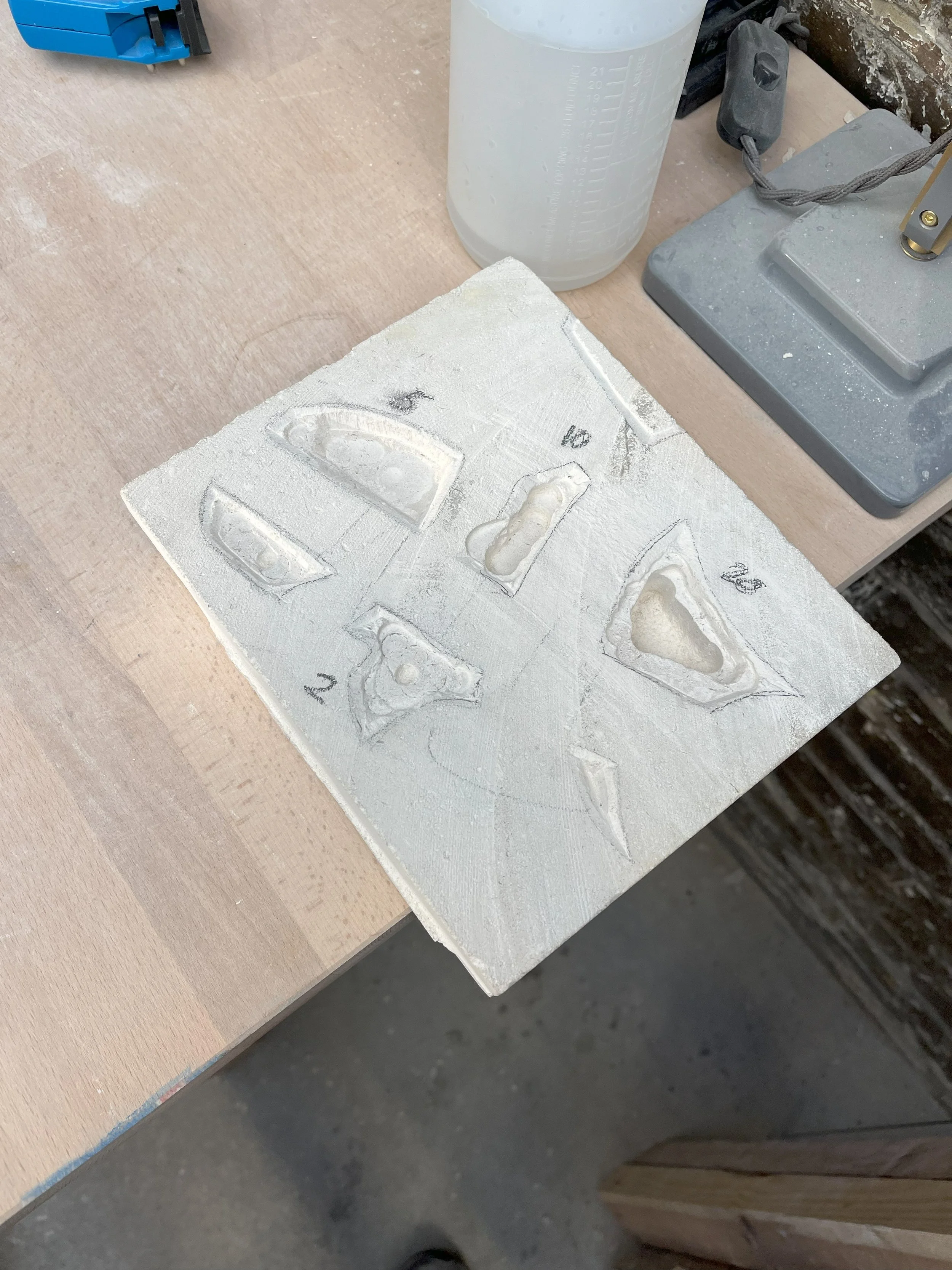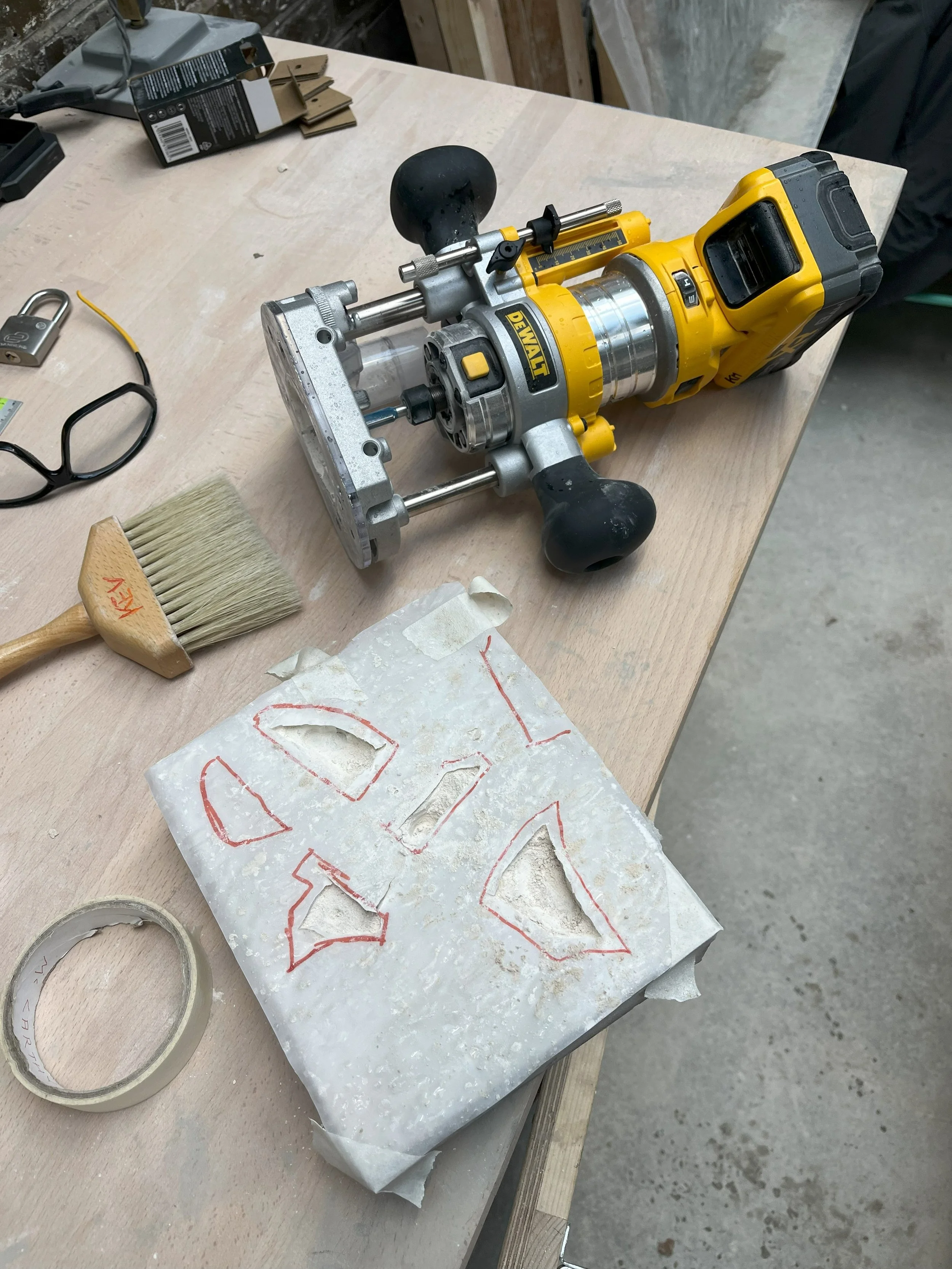 After construction of the clay model, It was decided to skip the casting stage and move directly to preparing the stone for carving. Changes and adjustments that had been made in the clay model would need to be mapped with a new template. After the template is applied it is drawn on the stone and traced in with a point. Then void spaces are mapped out and drill guide holes are set for the router use that will come later.