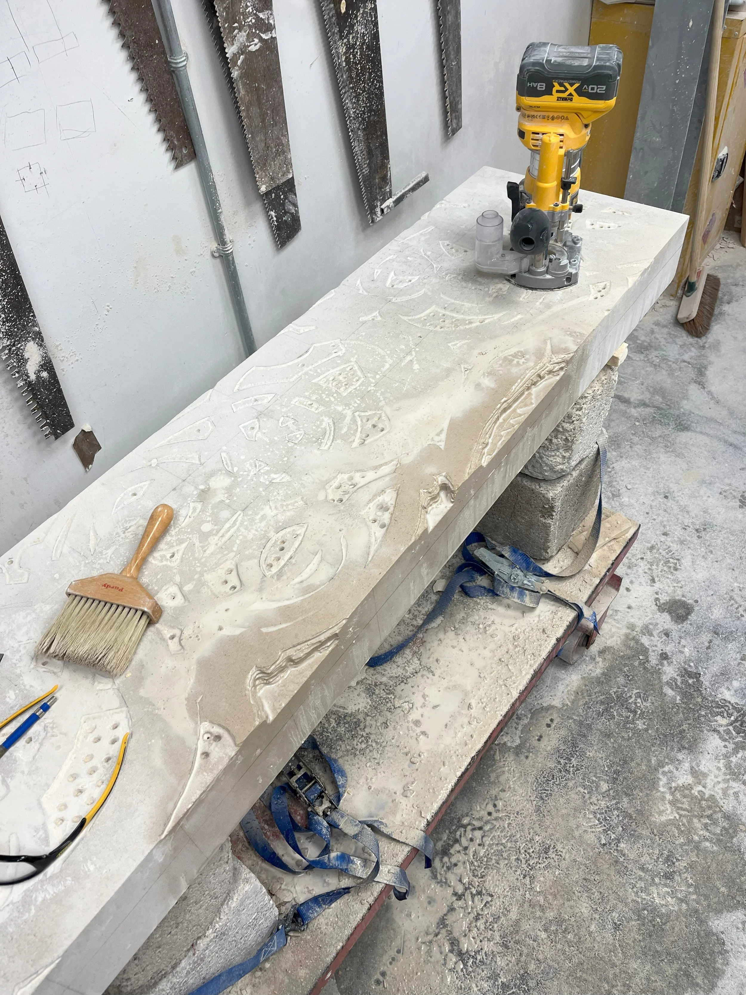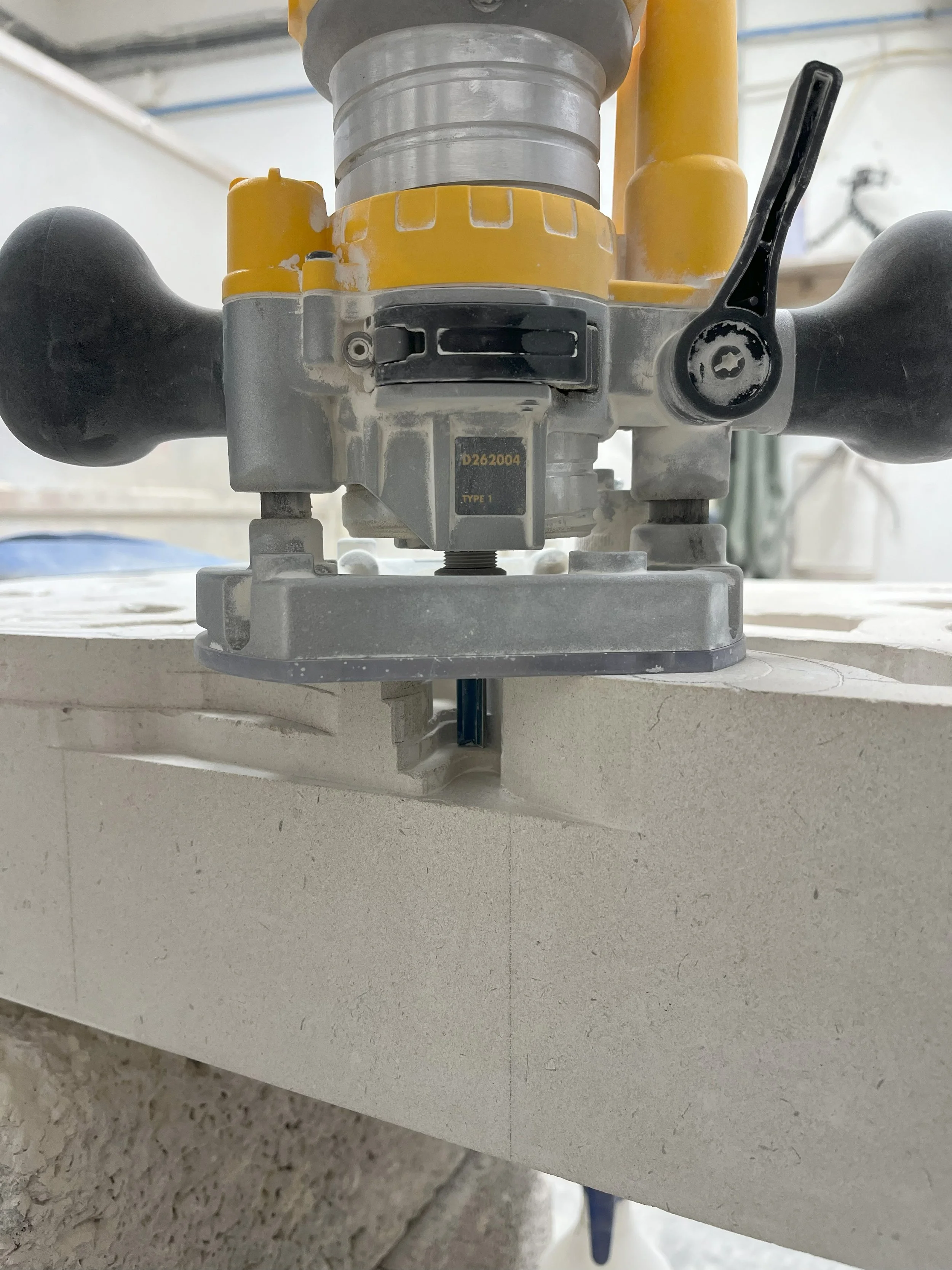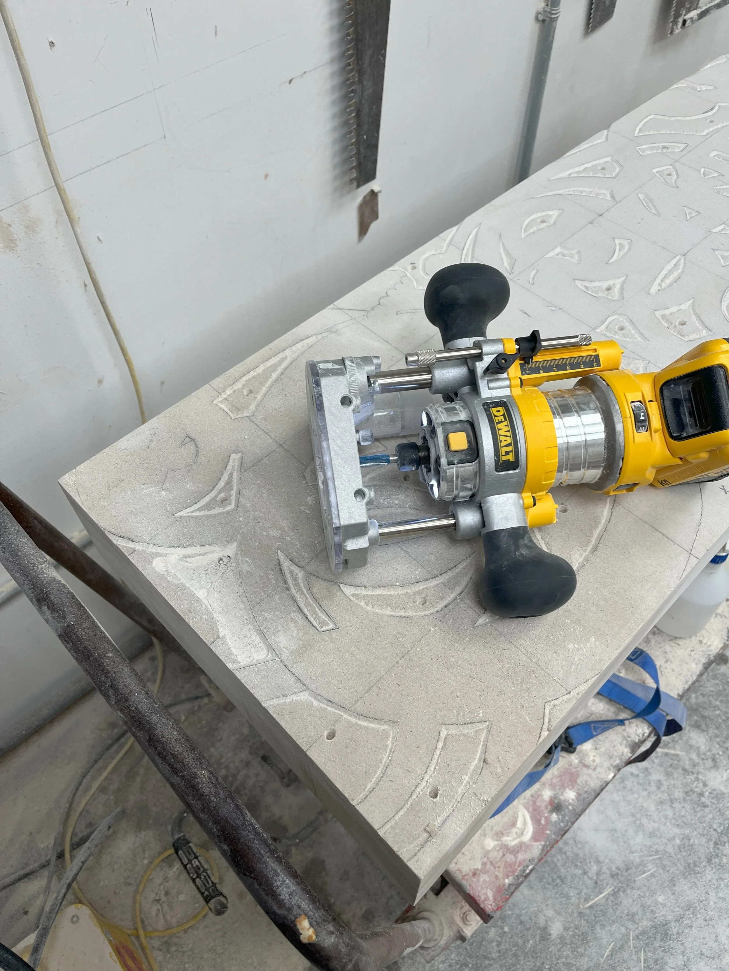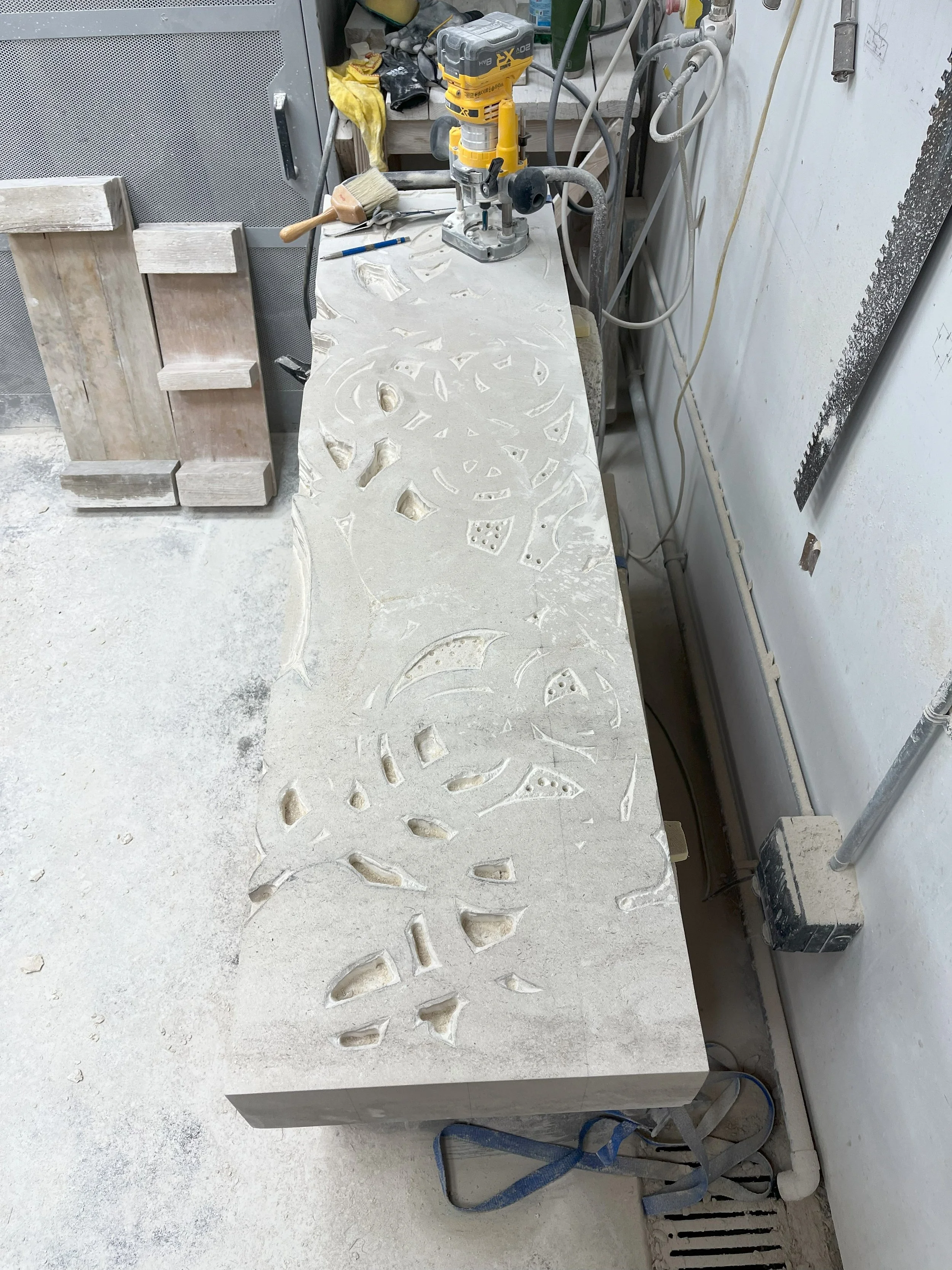 After Template construction and application to the stone, it is necessary to drill the void spaces and then use a router to clear out the excess stone from the void areas. The router also leaves a nice finished surface on areas worked that should help speed carving later.