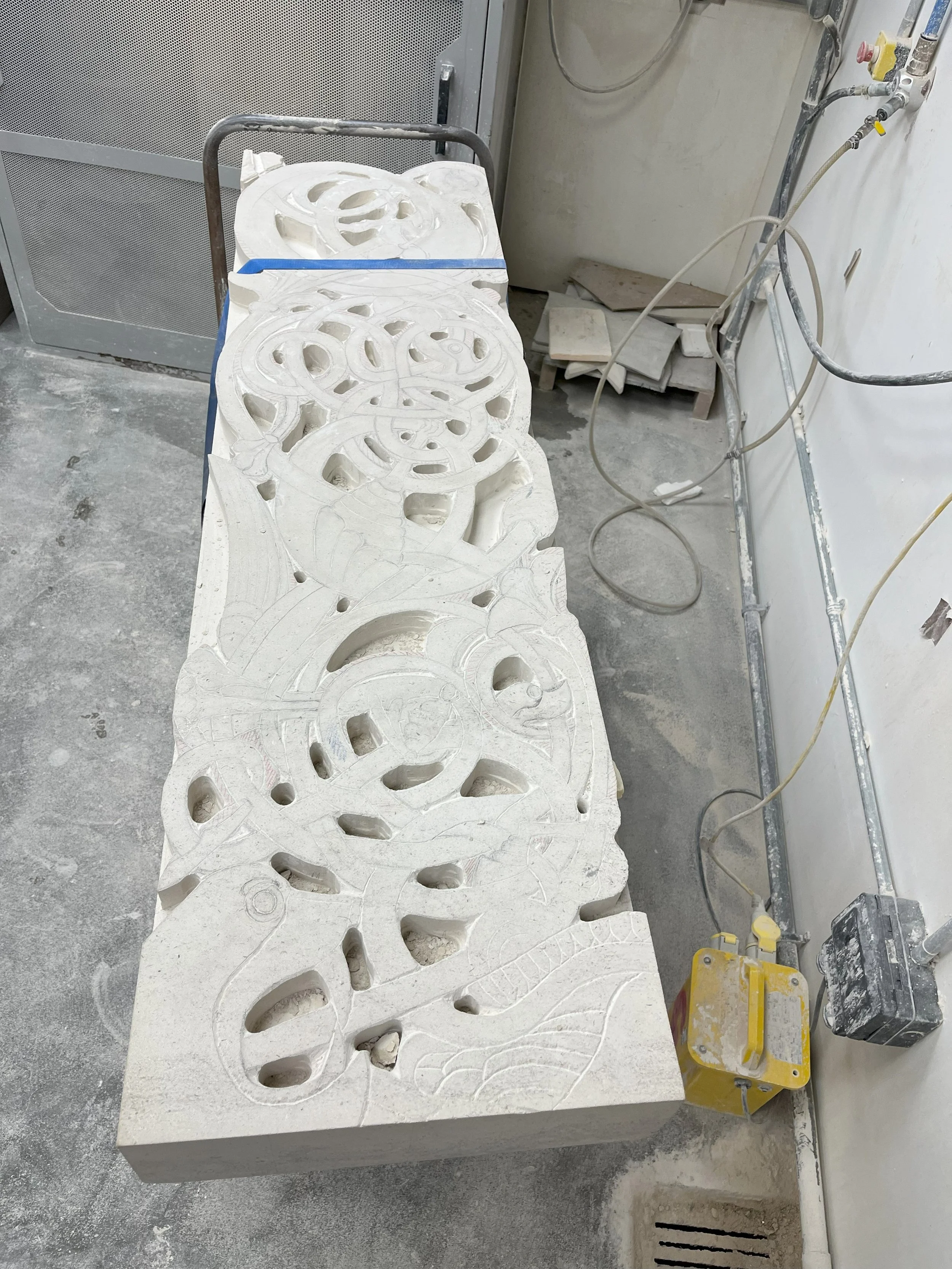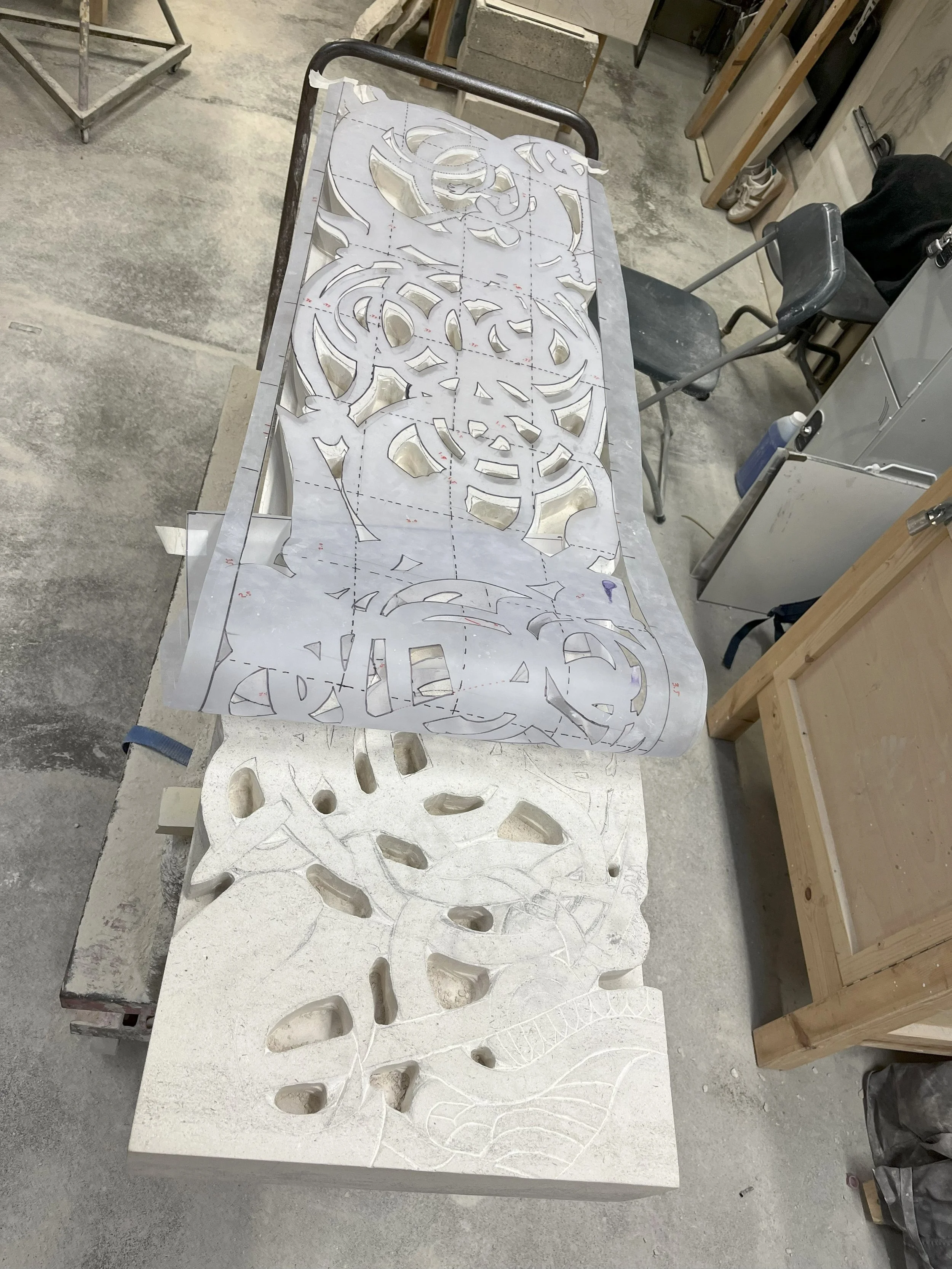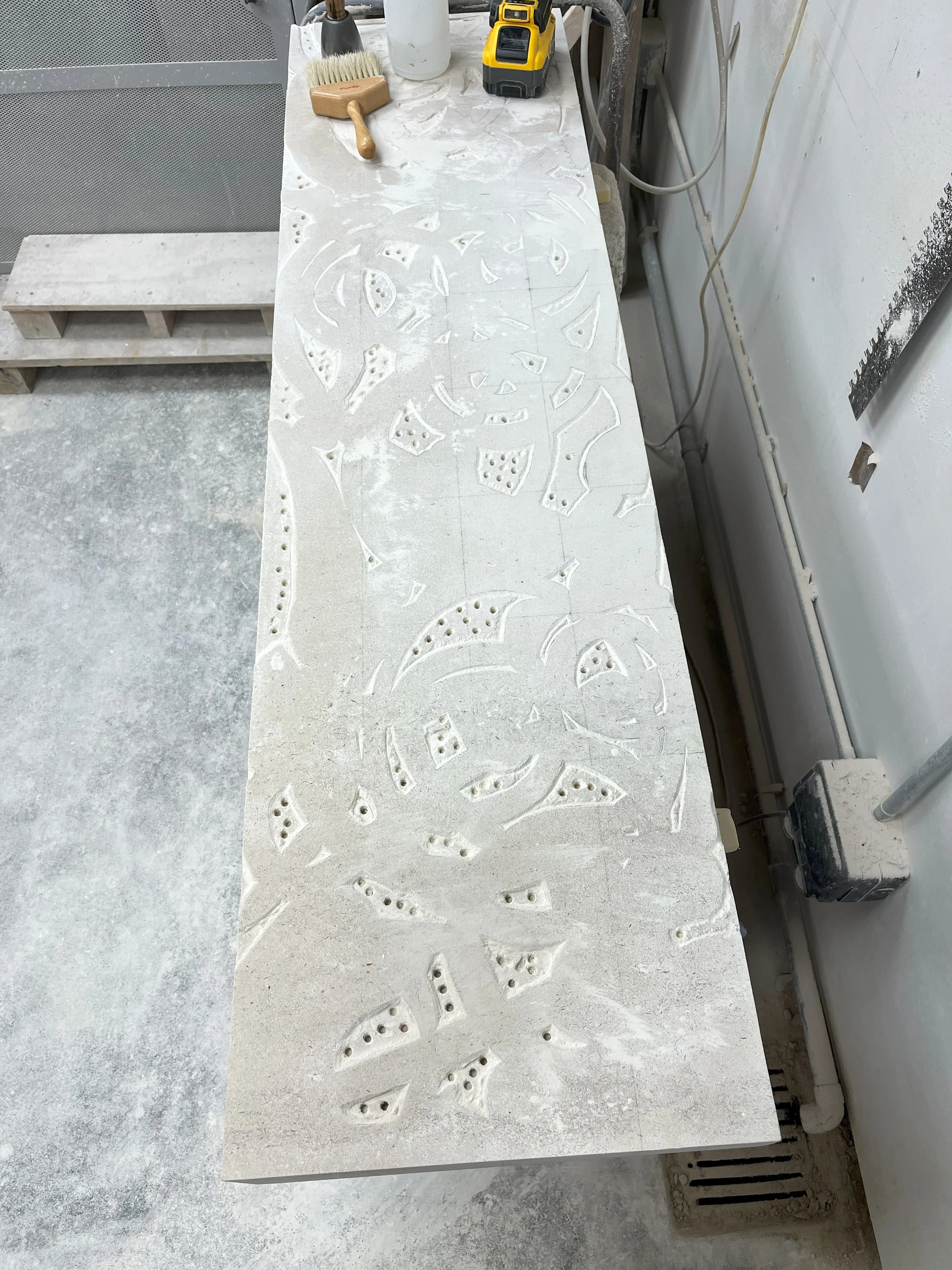 After Template construction and application to the stone, it is necessary to drill the void spaces and then use a router to clear out the excess stone from the void areas. The router also leaves a nice finished surface on areas worked that should help speed carving later.