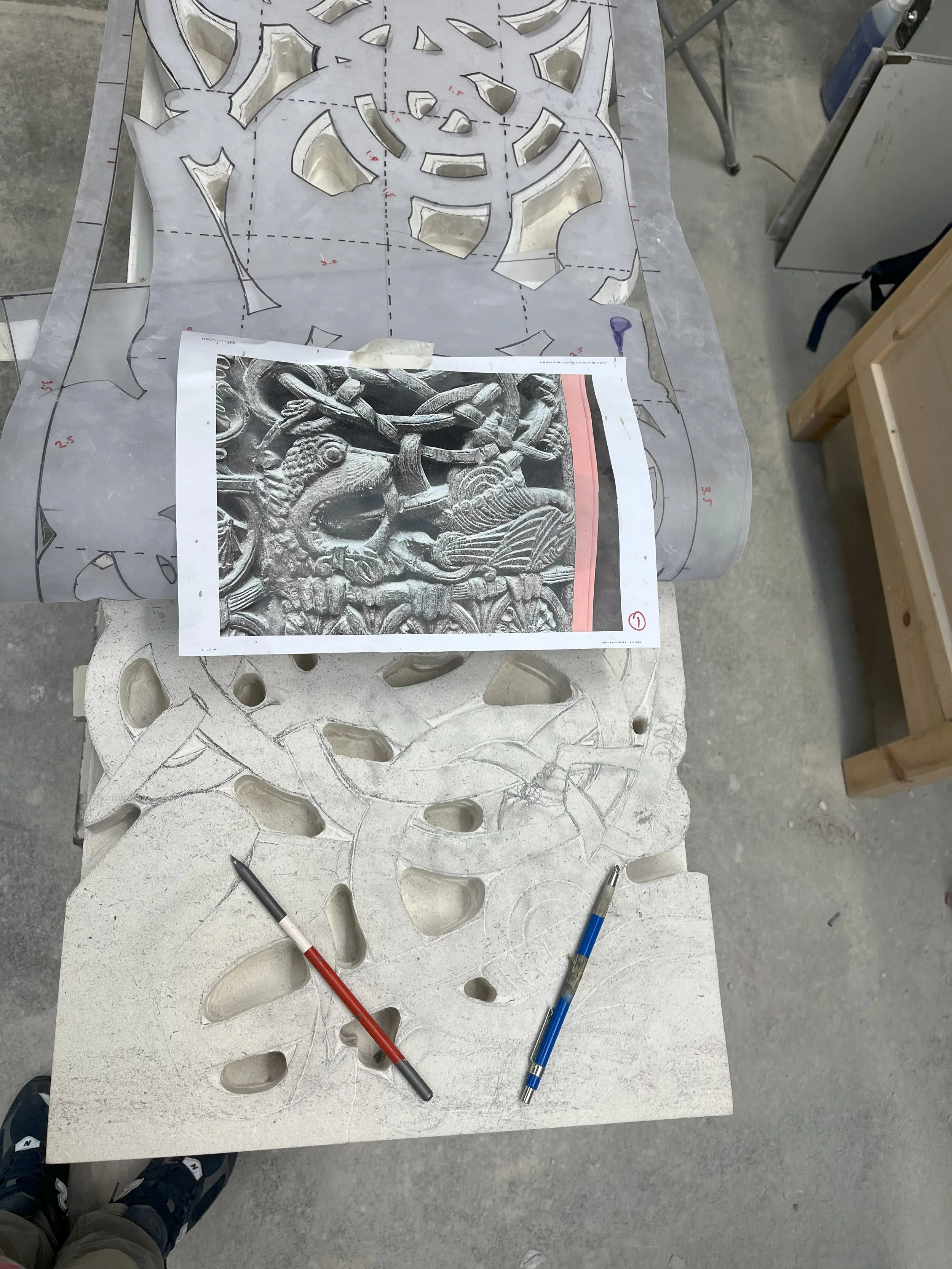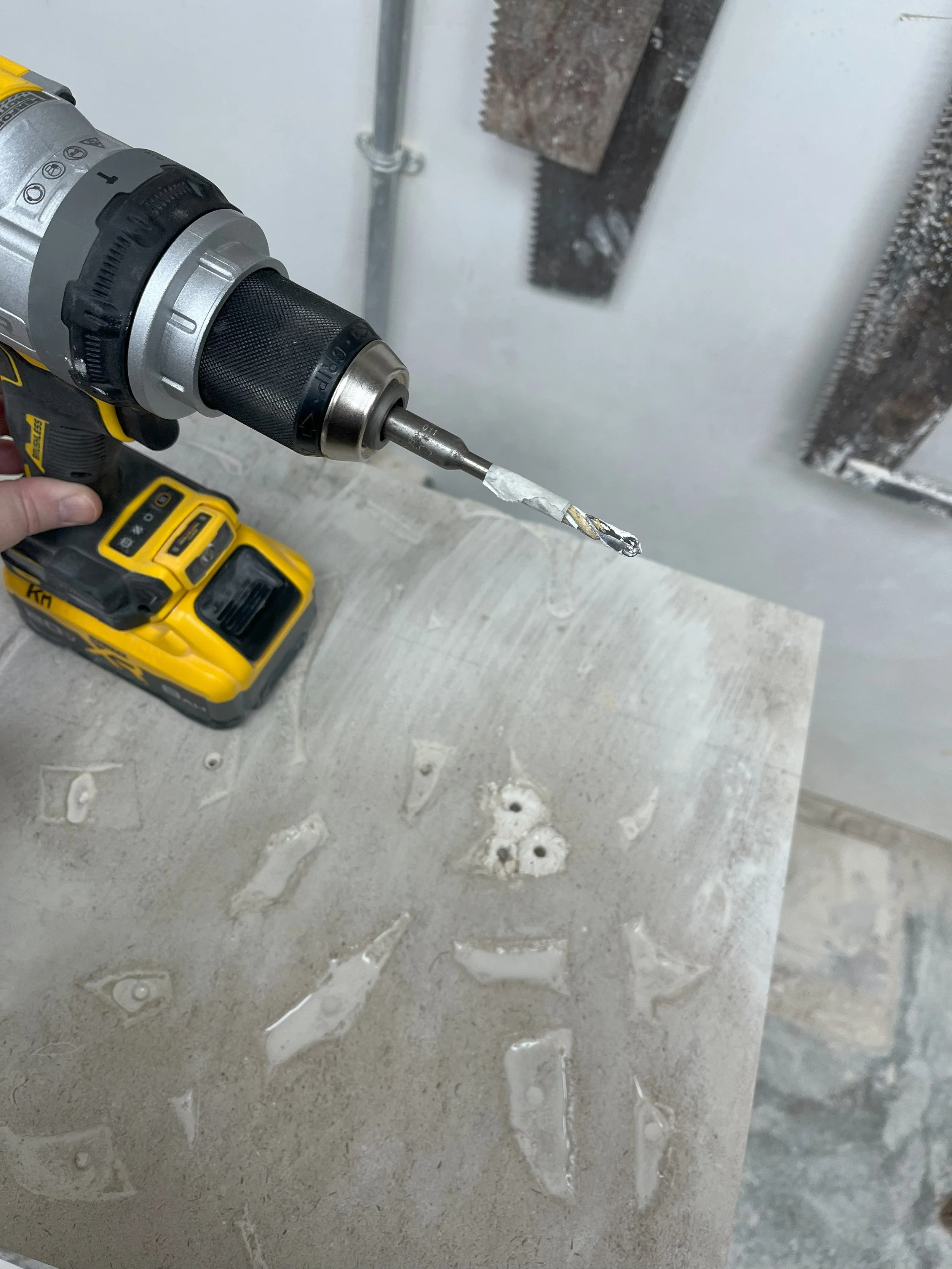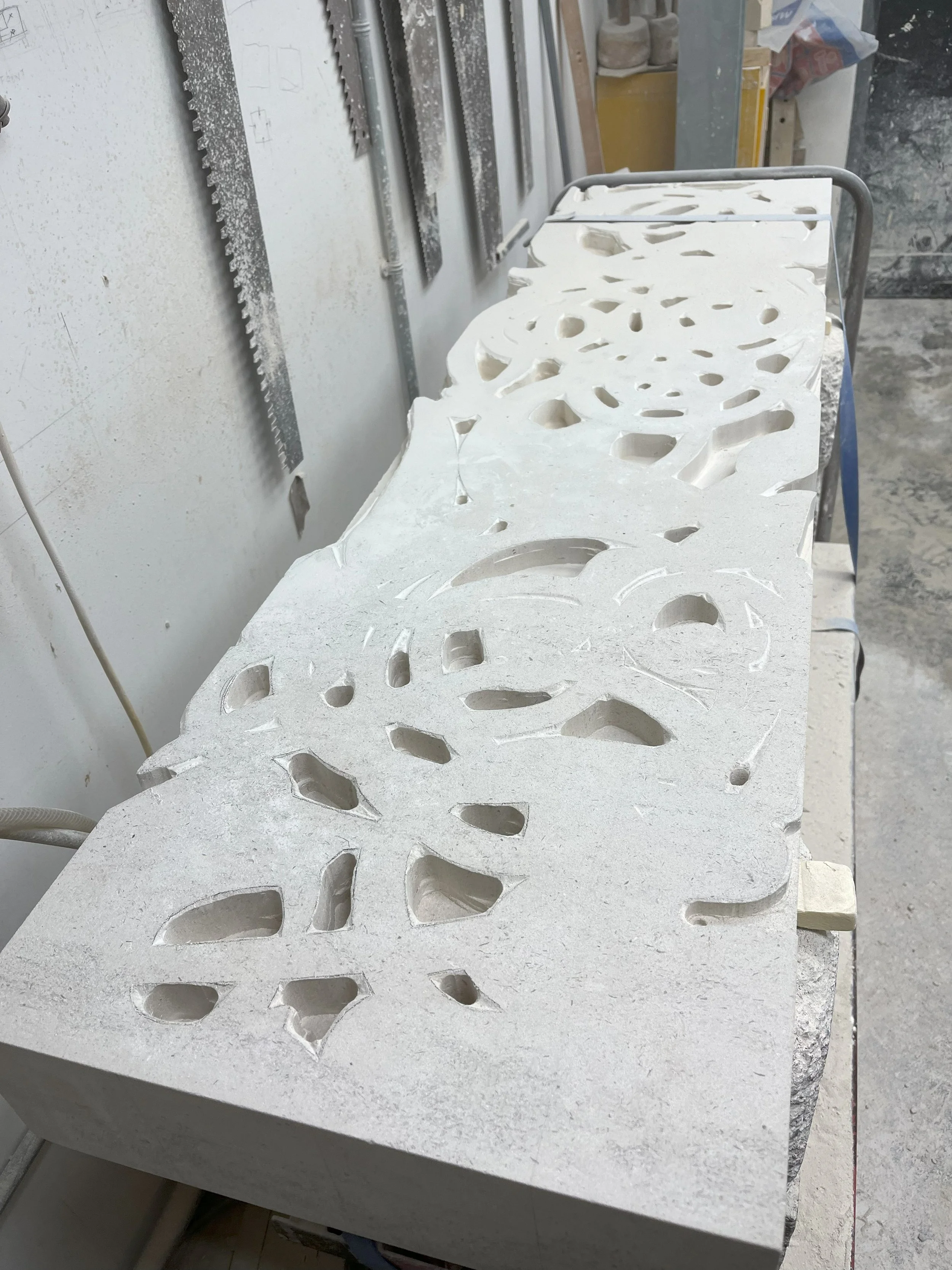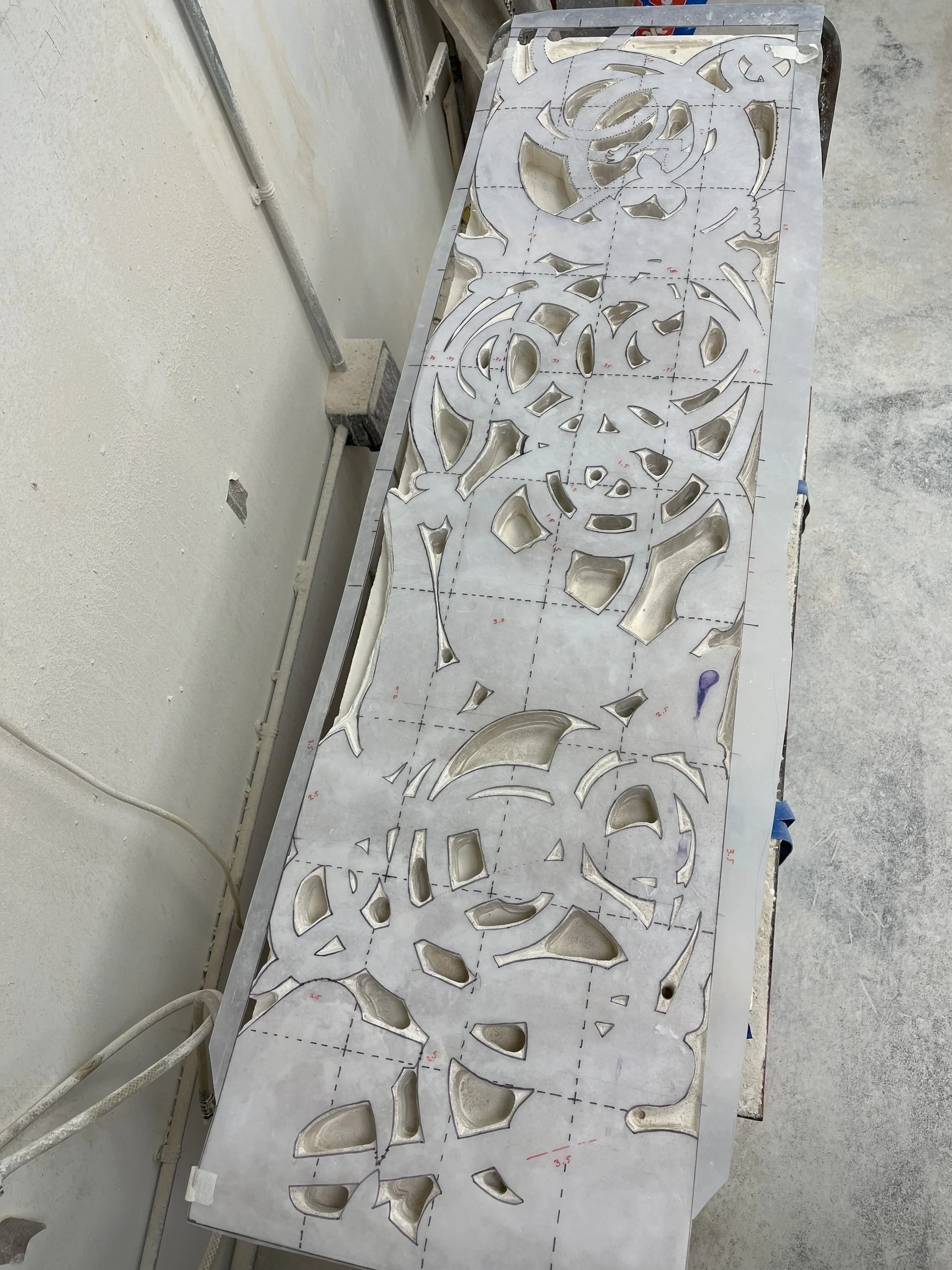 After Template construction and application to the stone, it is necessary to drill the void spaces and then use a router to clear out the excess stone from the void areas. The router also leaves a nice finished surface on areas worked that should help speed carving later.